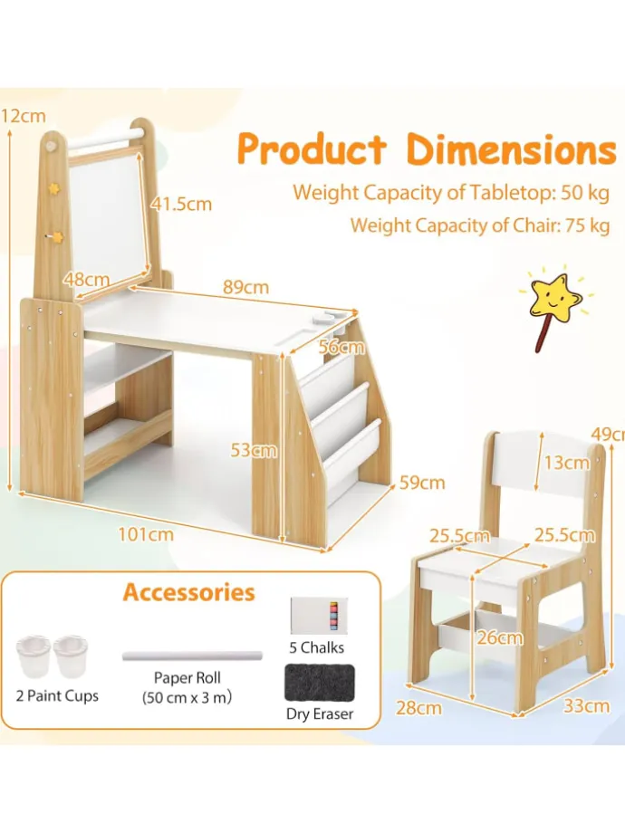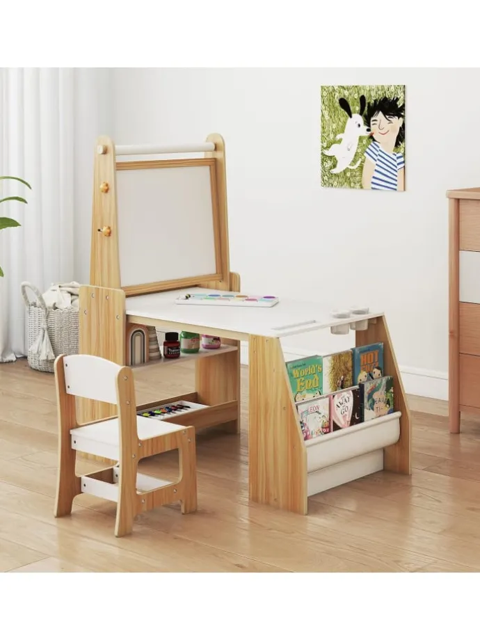 Bauen Sie ein Aktivitätszentrum für Kinder mit unserem Kunsttisch- und Stuhl-Set! Es gibt einen Tisch, einen Stuhl und eine Staffelei für Kinder, um verschiedene Aktivitäten auszuprobieren. Die doppelseitige Kinderstaffelei verfügt über ein magnetisches Whiteboard, eine Kreidetafel und eine austauschbare Papierrolle für ausreichend Zeichenfläche. Der ergonomische Stuhl sorgt für ein bequemes Sitzerlebnis. Zusätzlich bieten 1 breiter Tisch, ein 2-stufiges Bücherregal und 2 offene Regale reichlich Stauraum, um das Zimmer ordentlich zu halten.