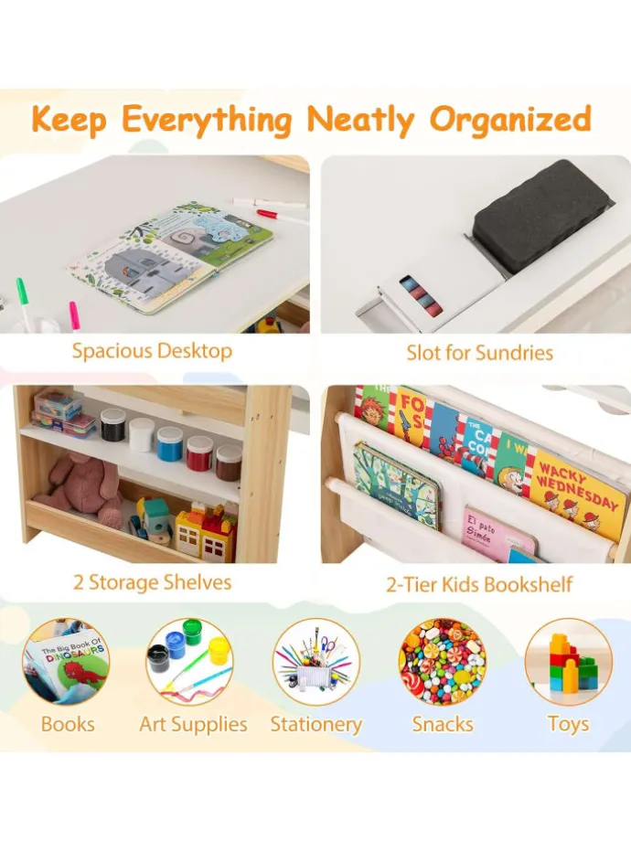 1 breite Tischplatte, 2-stufiges Bücherregal und 2 offene Regale für Bücher, Spielzeug