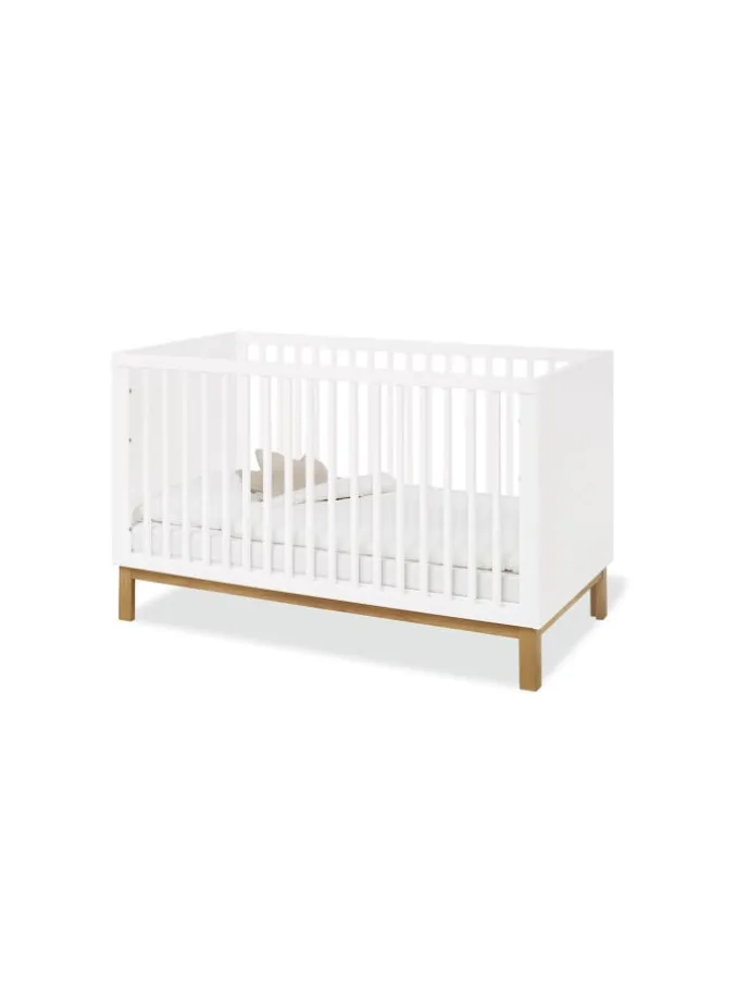 Kinderzimmer-Set Juna breit mit Windeleimerauszug, 3-tlg.: 3-teiliges Kinderzimmer-Set ‚Juna‘ breit mit Kinderbett und breiter Wickelkommode inkl. Windeleimerauszug. Edelmatt: MDF Uni, weiß lackiert und massiv, Eiche klar lackiert. Kinderbett L 144 x B 77 x H 87 cm, Matratzenmaß 140 x 70 cm, Wickelkommode B 129 x T 78 bzw. 67 x H 102 cm. Das Gitterbett ist mit 3 praktischen Schlupfsprossen ausgestattet. Für ein leichtes aus dem Bett heraus- und wieder hereinkrabbeln. Der Lattenrost von ‚Juna‘ ist 3-fach höhenverstellbar (von 24 auf 40 und 53 cm). Umbaubar zu Kindersofa und Juniorbett. ‚Juna‘ bietet viel Platz: In den 2 Schubkästen befinden sich 2 innenliegende Schubladen, eine davon mit 4-facher Wäscheeinteilung. Der Wickelaufsatz kann abgenommen werden und die 3-fache Einteilung wahlweise links oder rechts montiert werden, Wickelhöhe 92 cm. Die elegante Lösung den Windeleimer im Kinderzimmer zu platzieren: In der Wickelkommode. Der Auszug ist passend für gängige Windeleimer mit einem Ø 24 cm und einer max. Höhe von 50 cm (z.B. der Chicco Windeleimer Odour Off). Ausgestattet mit Self-Soft-Close. Pinolino erfüllt seit 1997 Kinderträume und vertreibt Kindermöbel, Accessoires und Spielwaren. Das deutsche, FSC®-zertifizierte Unternehmen verwendet ausschließlich für Kinder geeignete Lacke, Lasuren und Öle.