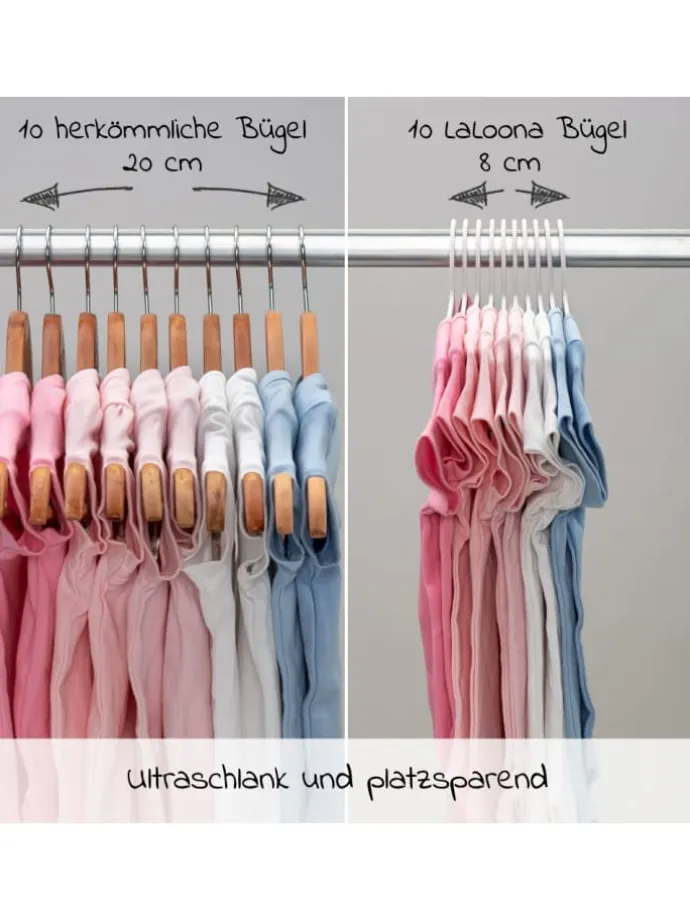 Für alle Kleidungstypen geeignet Praktisches 22er Pack Kleiderbügel von LaLoona für mehr übersicht und Ordnung im Kleiderschrank. Endlich hat das Suchen ein Ende – diese stabilen Universalkleiderbügel bieten verschiedene Hänge-Möglichkeiten für Deine Babykleidung. Auf ihnen lassen sich Oberteile, Strampler, Kleider und Jäckchen mit den Größen 62 bis 116 knitterfrei aufhängen. über die Stange kannst Du beispielsweise Hosen sowie Röcke legen. An den großen seitlichen Haken lassen sich Kleidungsstücke mit eingenähten Schlaufen aufhängen. So hast Du alles übersichtlich, griffbereit und sparst Dir viel Zeit und Nerven beim Ankleiden Deines Kindes. Ultra schmal & platzsparend Die langlebigen Kleiderbügel bestehen aus besonders leichtem und bruchsicheren Kunststoff. So eignen sie sich auch prima für unterwegs und sorgen selbst im Urlaub für eine ordentlich aufgebügelte Babykleidung. Da die Bügel so schmal sind, hast Du mehr als zweimal so viel Platz im Kleiderschrank als mit Holzkleiderbügeln. Das solltest Du noch wissen