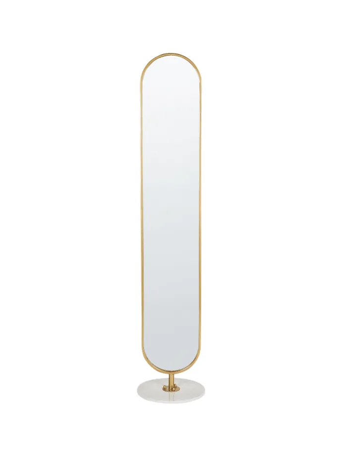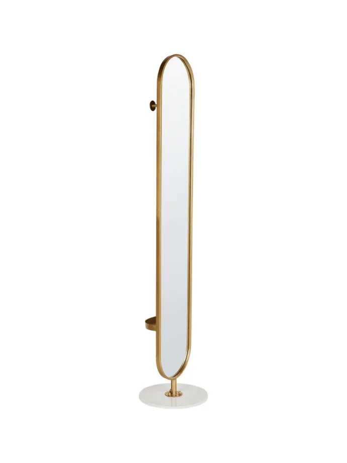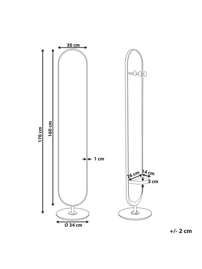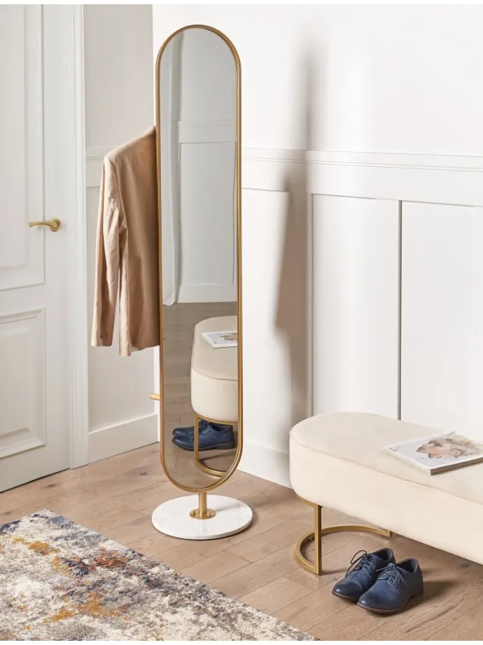 Freistehender, stabiler Kleiderständer mit Marmorfuß, Spiegel und 3 Haken. Dieser elegante Garderobenständer bietet auf einer Seite einen Spiegel in voller Länge und auf der Rückseite drei Kleiderhaken und eine praktische Ablagefläche für kleine Gegenstände. Der goldene Metallrahmen und der Marmorsockel verleihen ihm elegante Note und machen den Kleiderständer zu einer stilvollen und funktionalen Ergänzung für jeden Flur oder jedes Schlafzimmer. Ideal, um Ordnung in Ihrem Raum zu schaffen und gleichzeitig als praktische Ankleidefläche zu dienen.