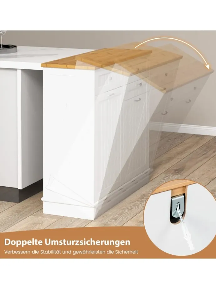 Die praktische Arbeitsplatte bietet Platz zum Ausstellen oder Arbeiten. Darüber hinaus können kleine Gegenstände in der ausziehbaren Schublade verstaut werden. Mit einer kippbaren Tür kann der übelriechende und unordentliche Müll von Ihrem Blickfeld ferngehalten werden.