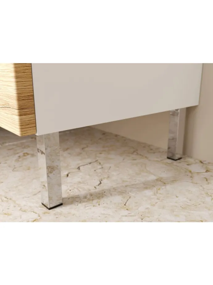 Edles Design trifft Funktionalität: Die Kommode VEER von Kadima Design besticht durch ihre elegante Kombination aus weißen Korpus und Fronten in Grandson-Eiche-Nachbildung. Dieses Möbelstück fügt sich nahtlos in jedes moderne oder klassische Interieur ein. Vier robuste Metallfüße in Chromoptik sorgen nicht nur für einen festen Stand, sondern unterstreichen auch das grifflose Design, das Eleganz und zeitgenössische Ästhetik ausstrahlt.