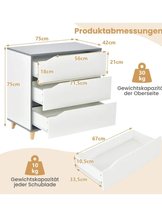 Sind Sie es leid, sich zu Hause oder im Büro mit Unordnung herumzuschlagen? Dann ist unser vielseitiger Schrank mit 3 Schubladen genau das Richtige für Sie! Dank des großen Stauraums können Sie alle Dinge des täglichen Bedarfs, von Kleidung und Decken bis hin zu Handtüchern und Spielzeug, problemlos verstauen und organisieren. Dieser Schrank eignet sich für verschiedene Einsatzbereiche, egal ob Wohnzimmer, Schlafzimmer, Garderobe oder Büro. Sein schlankes und modernes Design verleiht jedem Raum einen Hauch von Eleganz und wertet Ihre Inneneinrichtung auf. Aber das ist noch nicht alles – wir legen Wert auf Sicherheit und Langlebigkeit. Unser Schrank ist mit einer Umsturzsicherung ausgestattet, die einen sicheren Raum für kleine Kinder und Haustiere schafft.