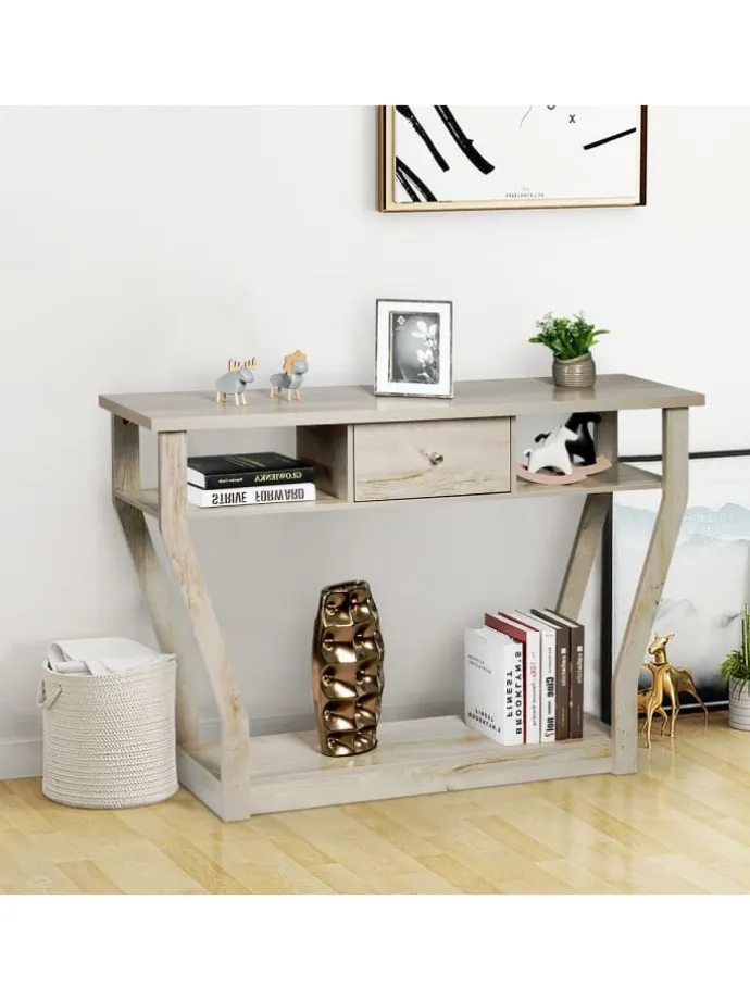 Unser eleganter und modischer Konsolentisch kann Ihnen ein schönes und ordentliches Wohnumfeld bieten. Der robuste und langlebige Tisch ist aus hochwertigem MDF hergestellt, besitzt harte Oberflächen, die verschleißfest und wasserfest sind, sodass diese nicht leicht zerkratzen. Das Untergestell und der Anti-Kippbeschlag sorgen für eine stabile und sichere Nutzung des Konsolentisches. Drei offene Regale und eine zusätzliche Schublade bieten genügend Stau- und Ausstellungsfläche, damit Sie Ihre Gegenstände nach Ihren Bedürfnissen sortieren können. Die einzigartig geschwungenen Beine sind stilvoll designt und sorgen für eine optimale Verwendung im Wohn- und Schlafzimmer, Flur und den Eingangsbereich.