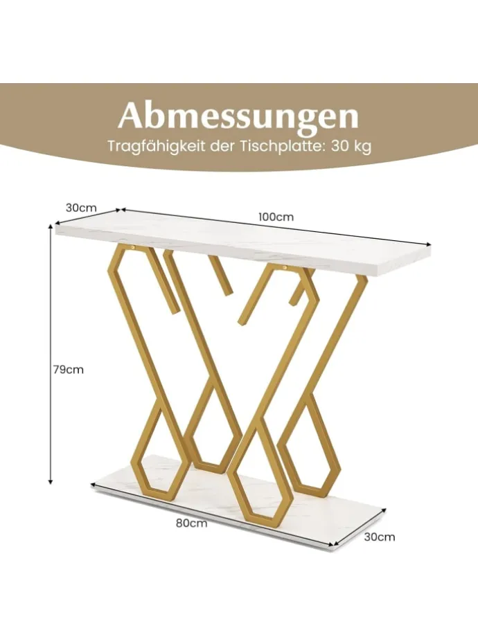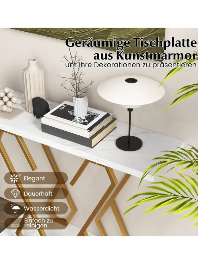 Mit seiner Tischplatte aus Kunstmarmor, die einen Hauch von Eleganz verleiht, ist der Konsolentisch in dieser Beschreibung sowohl stilvoll als auch praktisch. Mit den Maßen 100 x 30 cm (L x B) bietet die Tischplatte ausreichend Platz zum Abstellen von Snacks, Zeitschriften oder Dekoartikeln. Die verstärkte Metallbasis sorgt für Stabilität und Robustheit mit einer bemerkenswerten Tragfähigkeit von bis zu 75 kg. Sein besprühter Rahmen ist wirksam gegen Rost und gewährleistet eine dauerhafte Nutzung. Eine vergrößerte Basis und Kippsicherungen sorgen für zusätzliche Stabilität und Sicherheit, sodass er für jede Familie geeignet ist. Mithilfe der mitgelieferten Anleitung lässt er sich leicht zusammenbauen und die glatte Oberfläche macht die Reinigung zum Kinderspiel. Zögern Sie nicht länger, bestellen sie noch heute!