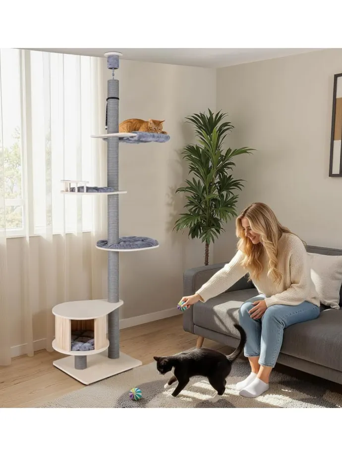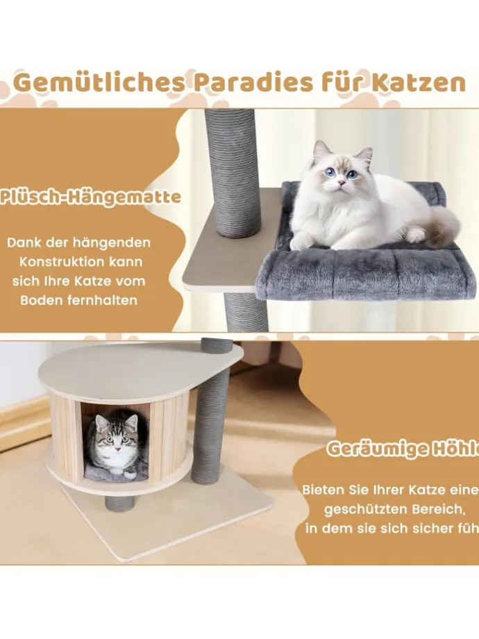 Nutzen Sie Ihren Wohnraum optimal aus und bieten Ihrer Katze mit dem Kratzbaum von Boden bis zur Decke den ultimativen Spiel- und Rückzugsort. Die höhenverstellbare Funktion passt sich verschiedenen Deckenhöhen an und gewährleistet so einen perfekten Sitz in jedem Raum. Die sichere, umzäunte Aussichtsplattform aus Pappelholz bietet Ihrem Liebling einen Rundumblick, während die großzügige Katzenwohnung darunter Privatsphäre und Komfort schafft. Mehrere Kratzpfosten unterstützen natürliche Kletter- und Kratzgewohnheiten und halten die Krallen gesund. Die Hängematte dient als gemütlicher Ruheplatz. Zudem laden die verschiedenen Ebenen der Kletteranlage zum Ausruhen oder Erkunden ein.