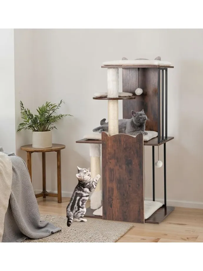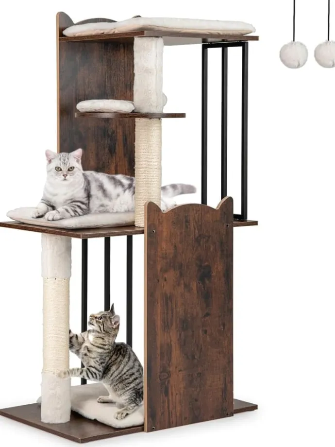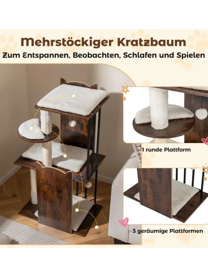 Bieten Sie Ihrer Katze einen großzügigen vertikalen Spielplatz und verschönern Sie gleichzeitig Ihre Wohnung! Unser 112 cm hoher, mehrstöckiger Katzenbaum ist mit 3 großen Ebenen plus einer runden Sprungplattform ausgestattet und bietet somit reichlich Möglichkeiten zum Klettern oder gemütlichen Nickerchen. Zusätzlich verfügt der Baum über natürliche Sisal-Kratzsäulen, die den Kratzinstinkt Ihres Lieblings befriedigen, sowie plüschige, herabhängende Bälle, die den Spieltrieb fördern und für Aktivität sorgen. Jede Liegefläche ist mit weichen, hautfreundlichen Kissen ausgestattet, die sich leicht abnehmen und reinigen lassen.