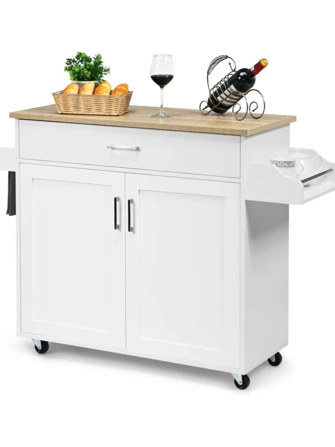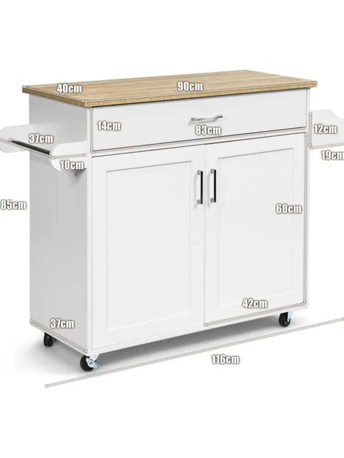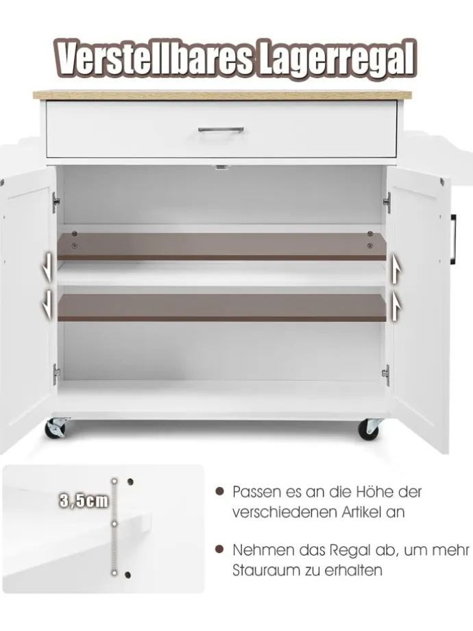 Ausgestattet mit einer geräumigen Arbeitsplatte, einer großen Schublade und einem Schrank bietet dieser Wagen reichlich Stauraum für Geschirr, Gläser, Lebensmittel usw. Das Regal im Innern kann in 3 Positionen verstellt werden, wodurch Sie den Abstand der Regale an die Aufbewahrungsgegenstände anpassen können. Ein speziell entworfenes Gewürzregal und ein Handtuchhalter machen es Ihnen leicht, die Handtuch- und Gewürzgläser jederzeit herauszunehmen. Ausgestattet mit 4 Universalrollen (2 davon mit Bremsen), bietet er Mobilität und Sicherheit. Egal ob Sie eine zusätzliche Arbeitsfläche wünschen oder Ihre Vorräte besser sortieren möchten, unser Küchenwagen ist die ideale Wahl.
