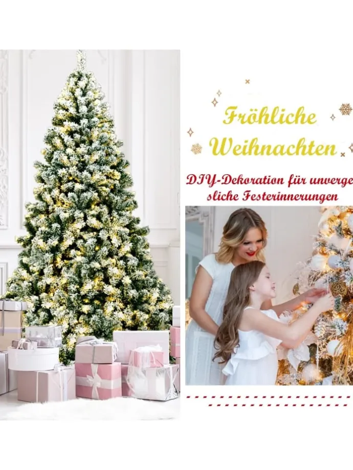 Verwandeln Sie Ihr Wohnzimmer in ein einzigartiges Winterwunderland mit unserem beleuchteten und schneebedeckten Weihnachtsbaum. Der Baum, der aus 1364 Zweigen und schneebedeckten Nadeln gefertigt ist, ist dicht und elegant. Er sieht fast wie ein echter Baum aus. Aus hochwertigem PVC hergestellt fallen die sorgfältig verarbeiteten Nadeln nicht leicht ab und verblassen nicht, was eine langfristige Nutzung gewährleistet. 550 warme LED-Leuchten, die an den Zweigenangebracht sind, bringen einen festlichen Glanz in Ihr Zuhause. Gestützt von einem stabilen Metallständer wird dieser künstliche Weihnachtsbaum auch in den kommenden Jahren aufrecht stehen. Gleichzeitig ist der Metallständer klappbar, um die Lagerung zu erleichtern. Dank der klappbaren Konstruktion lässt sich der künstliche Baum leicht aufstellen und aufschütteln. Darüber hinaus kann er in 4 Abschnitte unterteilt und in einer Aufbewahrungstasche untergebracht werden, sodass er später leicht wiederverwendet werden kann. Mit seinem hübschen Aussehen wird dieser schneebedeckte Weihnachtsbaum mit Sicherheit überall eine tolle Dekoration sein.