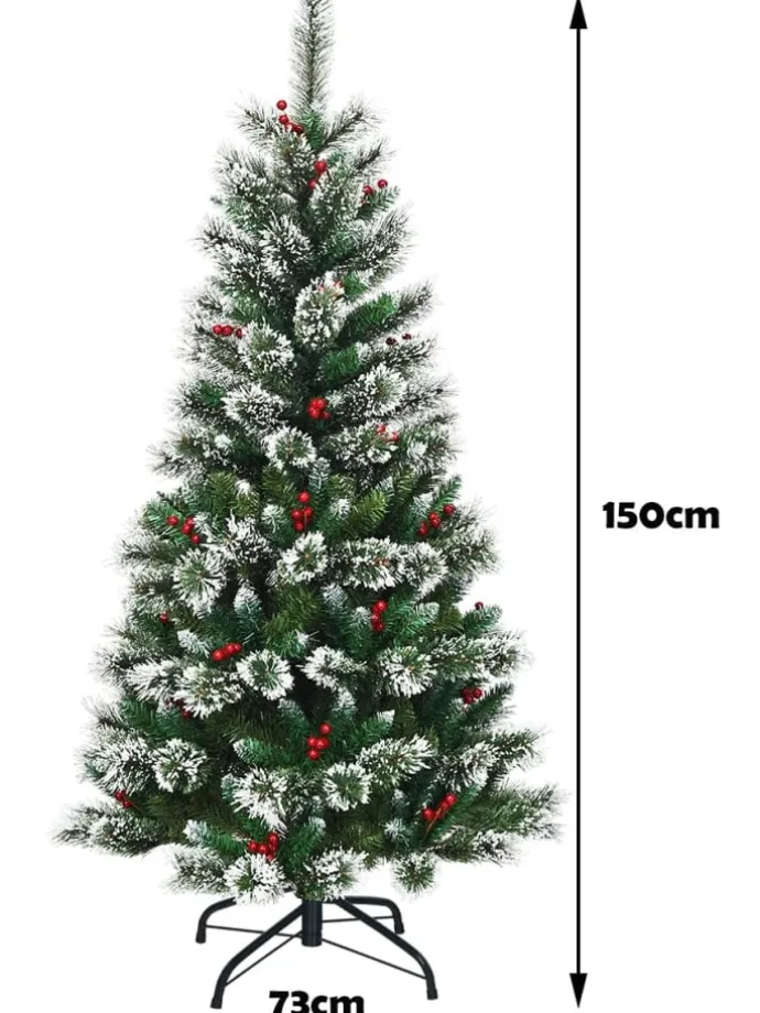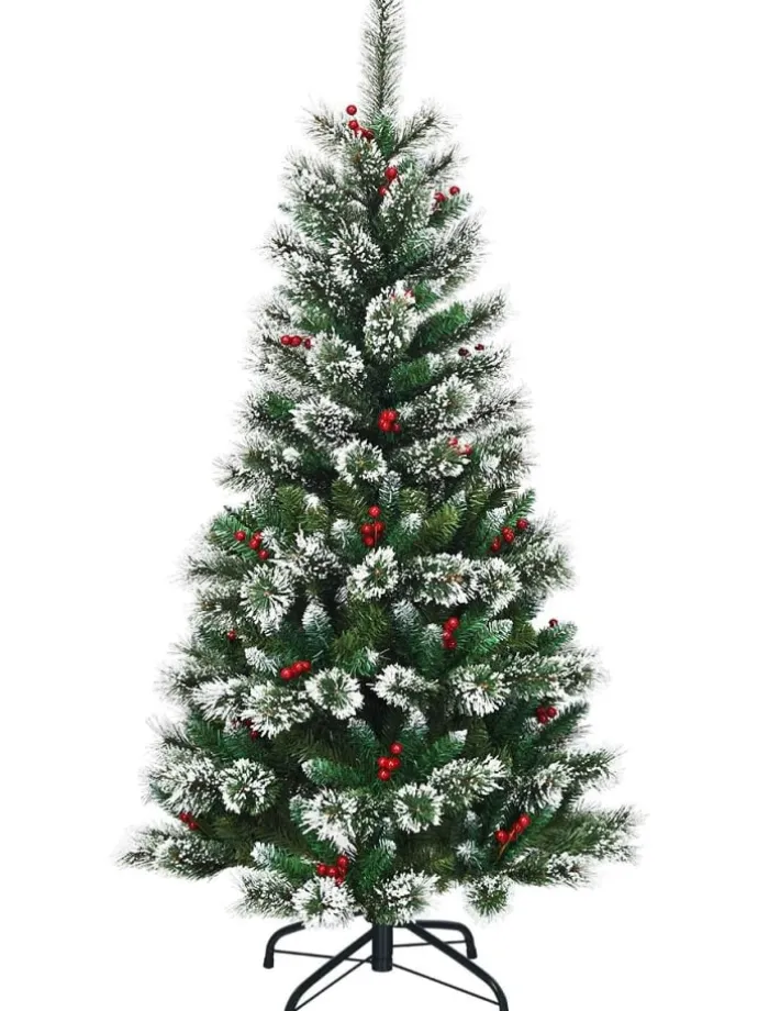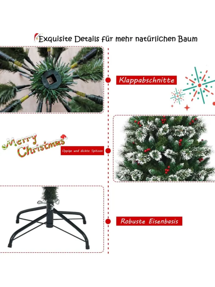Gibt es etwas Festlicheres als den Weihnachtsbaum? Bringen Sie dieses schneebedeckte künstliche Exemplar mit nach Hause und haben Sie einen Grund zum Jubeln. Er besteht aus 100 % neuem PVC und weist eine höhere Haltbarkeit, lebhaftere Farben und eine stabilere Struktur auf als ein billiger Baum, der recycelte Materialien verwendet. Außerdem zeichnet er sich durch sein auffälliges Design, die schöne Farbkombinationen und dekorative Weihnachtselemente aus. Nadeln mit Schneeflocken, leuchtend rote Beeren und grüne Zweige, all dies sorgt für eine schöne Optik, die die festliche Atmosphäre verstärkt. Der klappbare Baum lässt sich leicht zusammenbauen oder für eineeinfache Lagerung zerlegen. Dank des robusten Eisensockels steht er sehr stabil. Schmücken Sie Ihr Zimmer mit diesem künstlichen und dennoch schönen Weihnachtsbaum für eine Atmosphäre voll von Jubel und Festlichkeit.