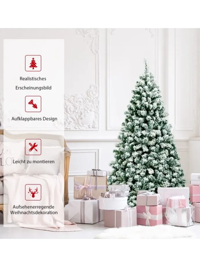 Verwandeln Sie Ihr Wohnzimmer in ein einzigartiges Winterwunderland mit unserem beleuchteten und schneebedeckten Weihnachtsbaum. Der Baum, der aus 928 Zweigen und schneebedeckten Nadeln gefertigt ist, ist dicht und elegant. Er sieht fast wie ein echter Baum aus. Aus hochwertigem PVC hergestellt fallen die sorgfältig verarbeiteten Nadeln nicht leicht ab und verblassen nicht, was eine langfristige Nutzung gewährleistet. 250 warme LED-Leuchten, die an den Zweigenangebracht sind, bringen einen festlichen Glanz in Ihr Zuhause. Gestützt von einem stabilen Metallständer wird dieser künstliche Weihnachtsbaum auch in den kommenden Jahren aufrecht stehen. Gleichzeitig ist der Metallständer klappbar, um die Lagerung zu erleichtern. Dank der klappbaren Konstruktion lässt sich der künstliche Baum leicht aufstellen und aufschütteln. Darüber hinaus kann er in 3 Abschnitte unterteilt und in einer Aufbewahrungstasche untergebracht werden, sodass er später leicht wiederverwendet werden kann. Mit seinem hübschen Aussehen wird dieser schneebedeckte Weihnachtsbaum mit Sicherheit überall eine tolle Dekoration sein.