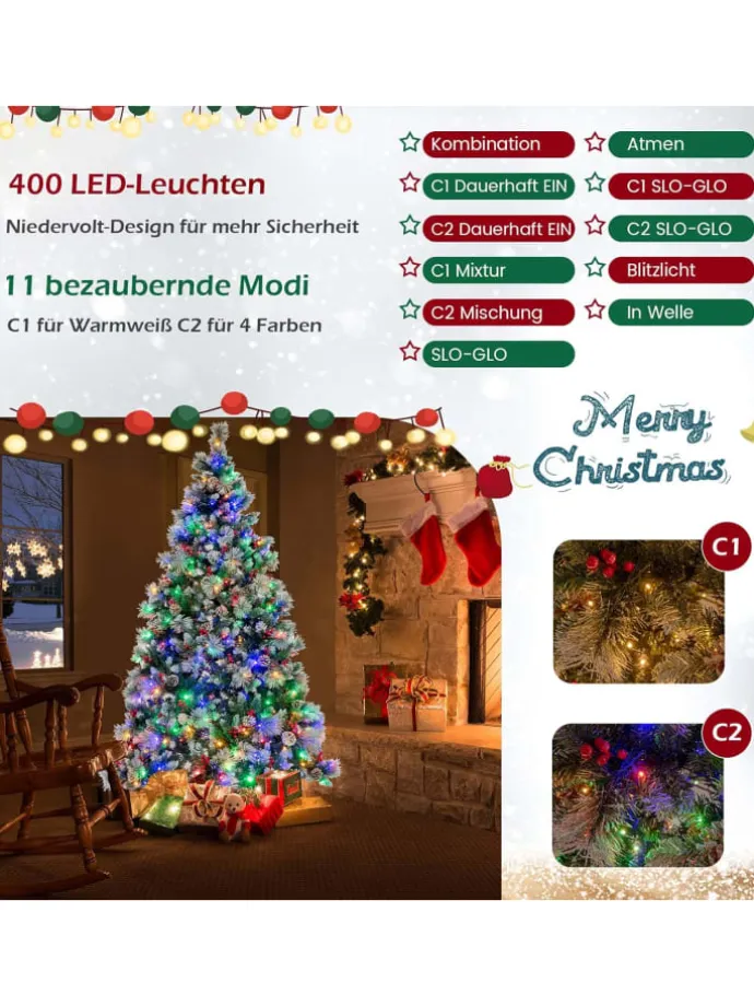 Hergestellt aus üppigem PVC und fächerförmigen Kiefernnadeln, bietet er ein naturgetreues Aussehen und ist eine gute Alternative zu einem echten Baum. Die üppigen PVC-Nadeln sind feuerfest und sorgen so für ein sicheres und langanhaltendes Erlebnis. Der Baum wird von 400 LED-Lichtern beleuchtet, die 11 dynamische Modi für bezaubernde Lichtshows erzeugen können, darunter Dauerlicht, Atmen, Blinken und mehr, die einen Hauch von schillerndem Charme verleihen. Um seine natürliche Schönheit hervorzuheben, ist der Baum mit 70 schneebedeckten Kiefernzapfen und 70 roten Beerenbüscheln geschmückt.