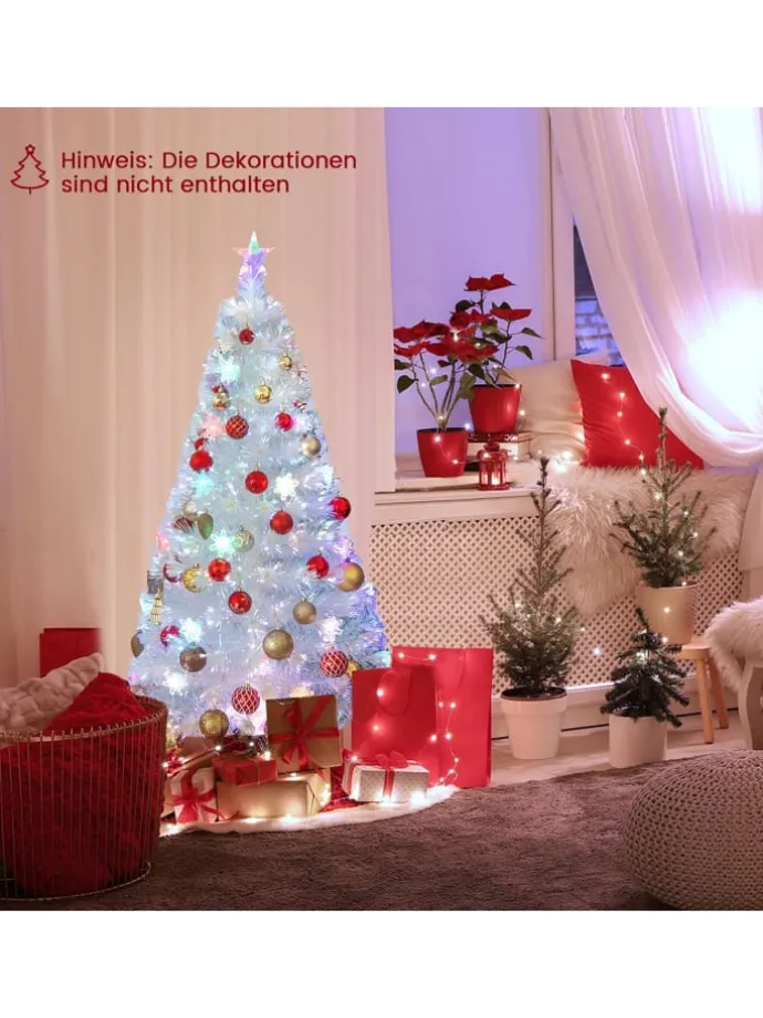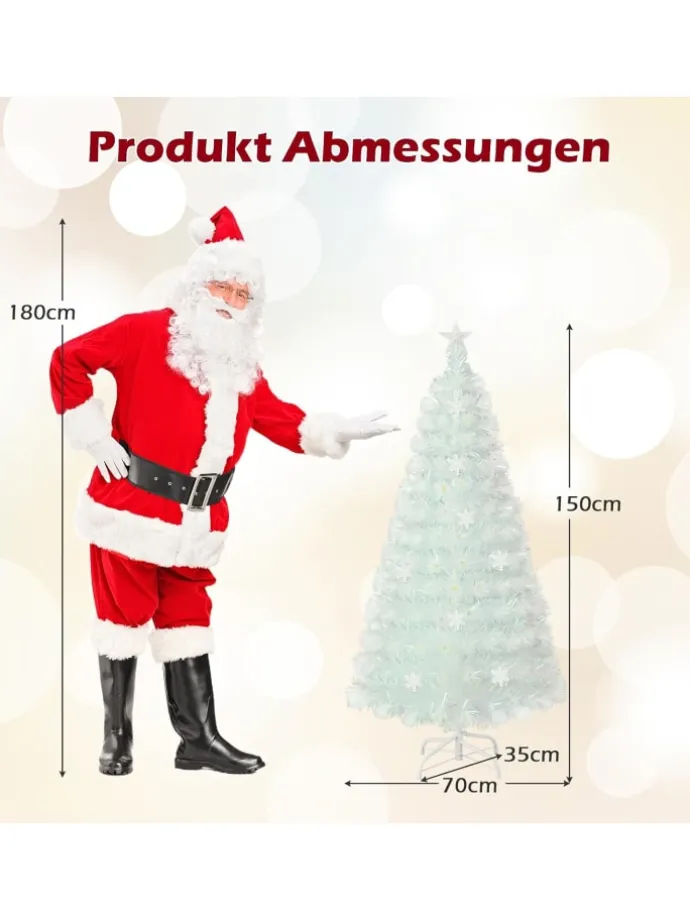 Schaffen Sie eine magische Weihnachtsatmosphäre mit unserem exquisiten weißen vorgestanzten Glasfaser-Weihnachtsbaum. Dieser wunderschöne vollständig weiße Weihnachtsbaum verfügt über 220 üppige Astspitzen und schimmernde schillernde Blätter, die eine faszinierende visuelle Anziehung bieten. Und mit seinen mehrfarbigen Schneeflocken-LED-Lichtern, dem top mehrfarbigen Sternenlicht und den leuchtenden Glasfasern bietet dieser beleuchtete Weihnachtsbaum ein fesselndes Festbeleuchtungsdisplay. Hergestellt aus hochwertigem Material, gewährleistet er Langlebigkeit und verleiht Ihrer festlichen Dekoration eine elegante Note. Er kommt mit einem überkreuzten Metallständer, der den Baum aufrecht hält und Brüche verhindert. Ob für Ihr Zuhause, Ihr Büro oder Ihre Veranstaltung, dieser weiße Weihnachtsbaum wird magische Erinnerungen schaffen und den Weihnachtsspirit Ihrer Feierlichkeiten bewahren.