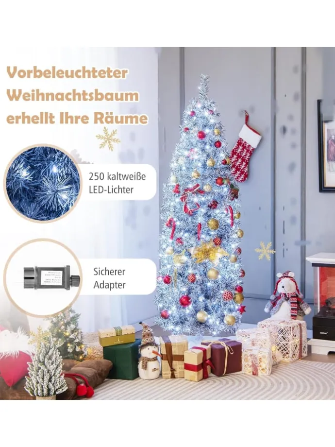 Verwandeln Sie Ihre Weihnachtsdekoration mit unserem atemberaubenden weiß-schwarz beleuchteten Weihnachtsbaum in eine wundervolle Landschaft. Die 475 üppigen Zweigspitzen, elegant verziert mit schwarzen und weißen Blättern, sorgen für eine einzigartige und auffällige Ästhetik. Und mit 250 kaltweißen LED-Lichtern strahlt dieser Baum ein kühles und klares Licht aus. Unser schlanker, bleistiftförmiger Weihnachtsbaum ist vielseitig und perfekt für jede Umgebung geeignet und eignet sich ideal für kleinere Räume oder als zusätzliches Dekorationselement. Ob zu Hause, im Büro oder bei einer Veranstaltung, dieser weiß-schwarz beleuchtete Weihnachtsbaum verleiht Ihren Weihnachtsfeierlichkeiten einen Hauch von Eleganz und Modernität.