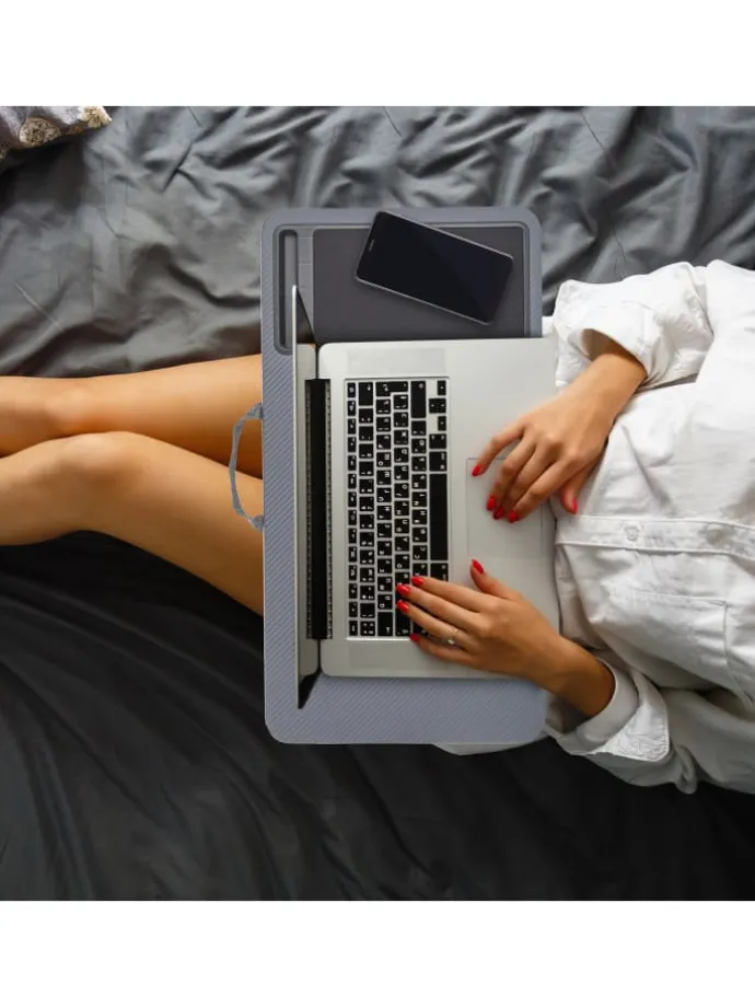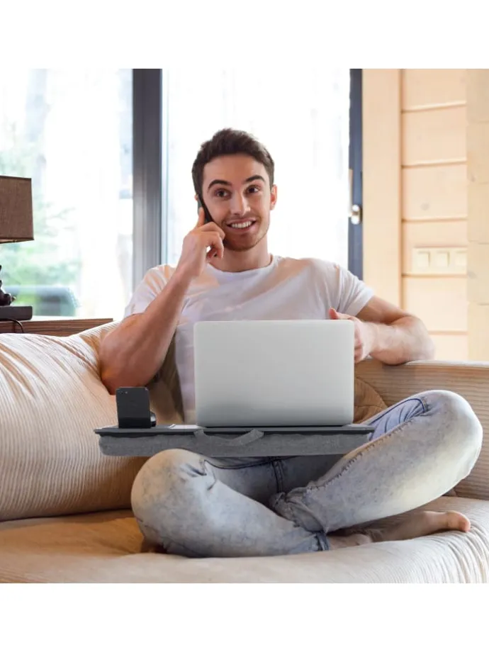 So macht Home Office Spaß! Mit diesem Notebookkissen arbeiten Sie gemütlich vom Bett oder Sofa aus. Neben einer großen Ablagefläche für den Laptop bietet das Schoßtablett ein integriertes Mauspad, eine Handyhalterung und einen Antirutsch-Streifen, sodass Ihr Notebook nicht herunterrutscht. Dank des weichen Kissens mit Styropor-Füllung liegt das Laptop-Kissentablett bequem auf Ihren Beinen, was einen maximalen Komfort garantiert.