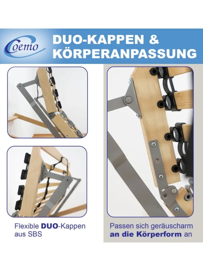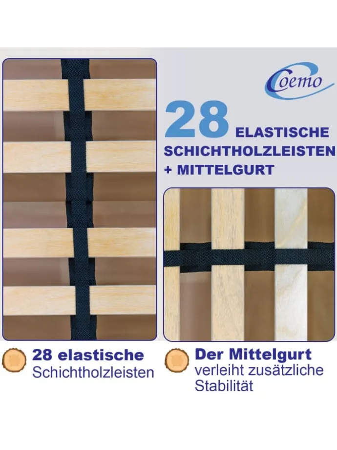 Der Rahmen besteht aus 28 mehrfach verleimten Federholzleisten aus robustem Buche- und Birken-Schichtholz. Dank der hochwertigen SBS-Duo-Kappen federn die Leisten angenehm mit und behalten auch nach Jahren ihre Form. Das 7-Zonen-System entlastet dort, wo Ihr Körper es braucht – weich an Schultern und Becken, stabil im Rücken. Die Mittelzone lässt sich mit wenigen Handgriffen individuell anpassen, damit Sie genau so liegen, wie es für Sie am bequemsten ist. Ein Mittelgurt verteilt das Gewicht gleichmäßig und erhöht die Stabilität.