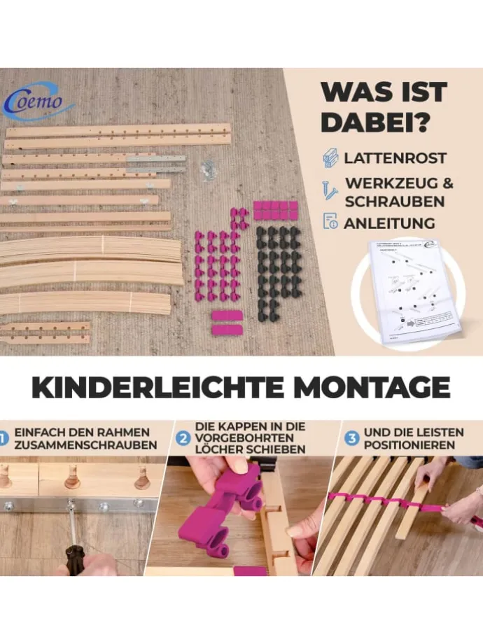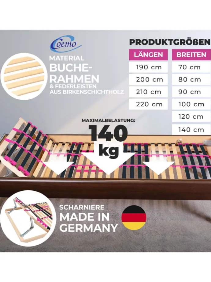 Ein besonderes Highlight sind die pinkfarbenen Akzente: Sowohl das Mittelband als auch sämtliche Härtegradschieber leuchten in kräftigem Pink und setzen ein modisches Statement in Ihrem Schlafzimmer. Die 28 mehrfachverleimten Federholzleisten aus hochwertigem Buche/Birke-Schichtholz bieten langlebige Stabilität, während die Duo-Kappen für flexible Anpassung an Ihre Körperkonturen sorgen. Durch die individuelle Härtegradregulierung in der Mittelzone lässt sich der Lattenrost exakt an Ihre Bedürfnisse anpassen – ideal für alle Schlaftypen, auch für Personen mit höherem Körpergewicht. Mit einer Belastbarkeit bis 140 kg und der Eignung für alle Matratzenarten ist der Pink Dream ein zuverlässiger Begleiter für erholsame Nächte.
