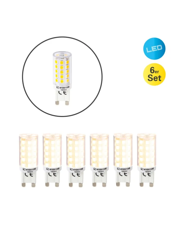 Die kompakten LED-Leuchtmittel G9/3,5W im praktischen 6er-Set bestehen aus Keramik und Kunststoff und überzeugen mit moderner LED-Technik. Sie sind mit jeweils 32 LEDs vom Typ SMD 2835 ausgestattet und eignen sich für den Einsatz im Innenbereich. Dank des unkomplizierten Sockels sind die Leuchtmittel einfach einsteckbar. Die LED Leuchtmittel passen in moderne Wohn- und Esszimmerleuchten und sind auch für Tisch- oder Stehlampen ideal. Sie haben mit etwa 20.000 Betriebsstunden eine sehr lange Lebensdauer. Mit 2900 K und 350 lm zaubern die nicht dimmbaren Leuchtmittel ein angenehm warmweißes Licht in jeden Wohnbereich.