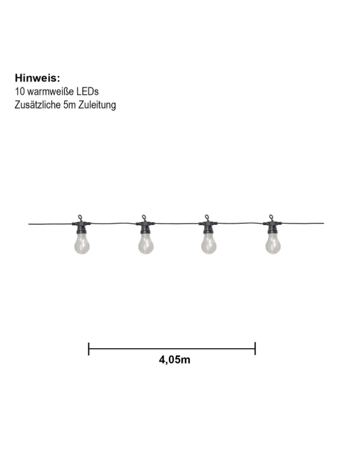 Die Lichterkette besteht aus 10 durchsichtigen LED Glühbirnen an einem 4,05 Meter langen Kabel