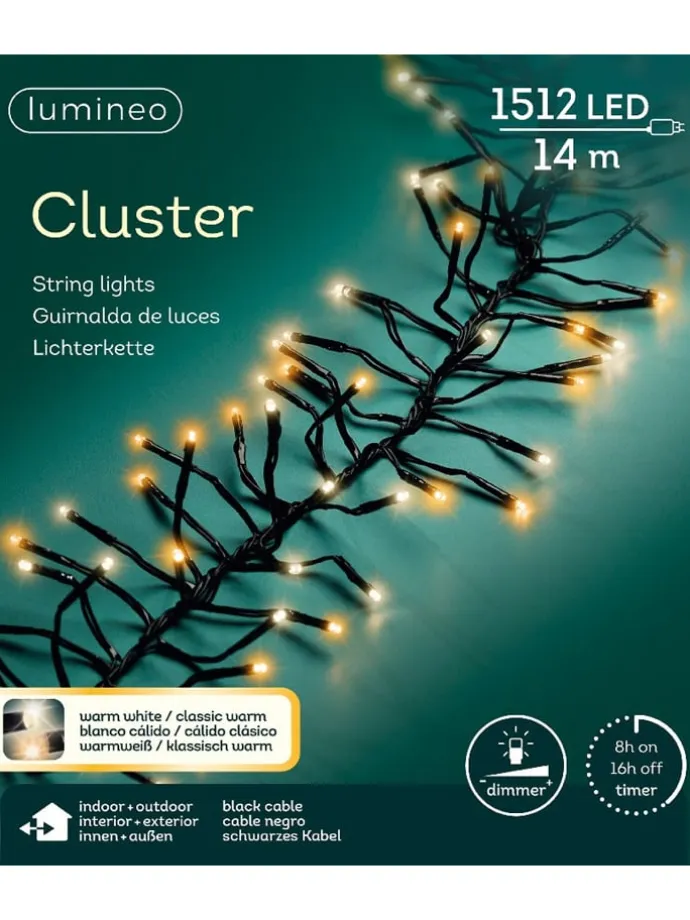 Lumineo Lichterkette CLUSTER 1.512 LED 14 m, 2-farbig Die Lichterkette verfügt über 1.512 LEDs welche in zwei Lichtfarben, warm weiß + klassisch warm, erstrahlen. Die 5 Stufen-Dimm-Funktion ermöglicht es, die Helligkeit nach Belieben anzupassen und somit die perfekte Atmosphäre zu schaffen. Dank der praktischen Timer-Funktion lässt sich die Lichterkette ganz bequem steuern, sodass sie automatisch 8 Stunden lang eingeschaltet und 16 Stunden ausgeschaltet ist. Diese Funktion spart nicht nur Energie, sondern sorgt auch dafür, dass die Lichterkette jeden Tag zur gleichen Zeit erstrahlt. Die Beleuchtung bietet zudem eine großzügige 5 m lange Zuleitung, wodurch die LED-Kette eine Gesamtlänge von 19 m besitzt. Mit dem IP44-Schutz ist sie Wetterbeständig und somit gegen Spritzwasser geschützt. Sie ist für den Innen- und Außenbereich geeignet. Für eine Baumhöhe von 150 – 180 cm geeignet. Die Lichterkette leuchtet in zwei Farbtönen gleichzeitig – diese lassen sich nicht Hin- und Her switchen.