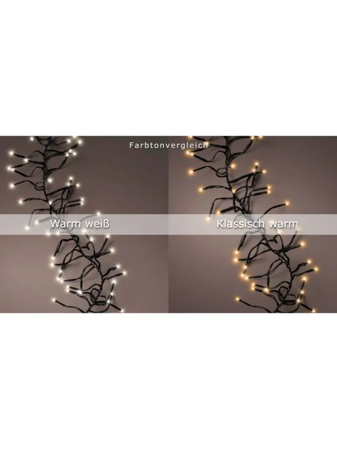 Lumineo Lichterkette CLUSTER 588 LED 5,5 m, klassisch warm Die Lichterkette verfügt über 588 LEDs welche in einem klassisch warmen Ton erstrahlen. Die 5 Stufen-Dimm-Funktion ermöglicht es, die Helligkeit nach Belieben anzupassen und somit die perfekte Atmosphäre zu schaffen. Dank der praktischen Timer-Funktion lässt sich die Lichterkette ganz bequem steuern, sodass sie automatisch 8 Stunden lang eingeschaltet und 16 Stunden ausgeschaltet ist. Diese Funktion spart nicht nur Energie, sondern sorgt auch dafür, dass die Lichterkette jeden Tag zur gleichen Zeit erstrahlt. Die Beleuchtung bietet zudem eine großzügige 5 m lange Zuleitung, wodurch die LED-Kette eine Gesamtlänge von 10,5 m besitzt. Mit dem IP44-Schutz ist sie Wetterbeständig und somit gegen Spritzwasser geschützt. Sie ist für den Innen- und Außenbereich geeignet. Mit Gütesiegel ausgezeichnet. Das Kabel ist schwarz.