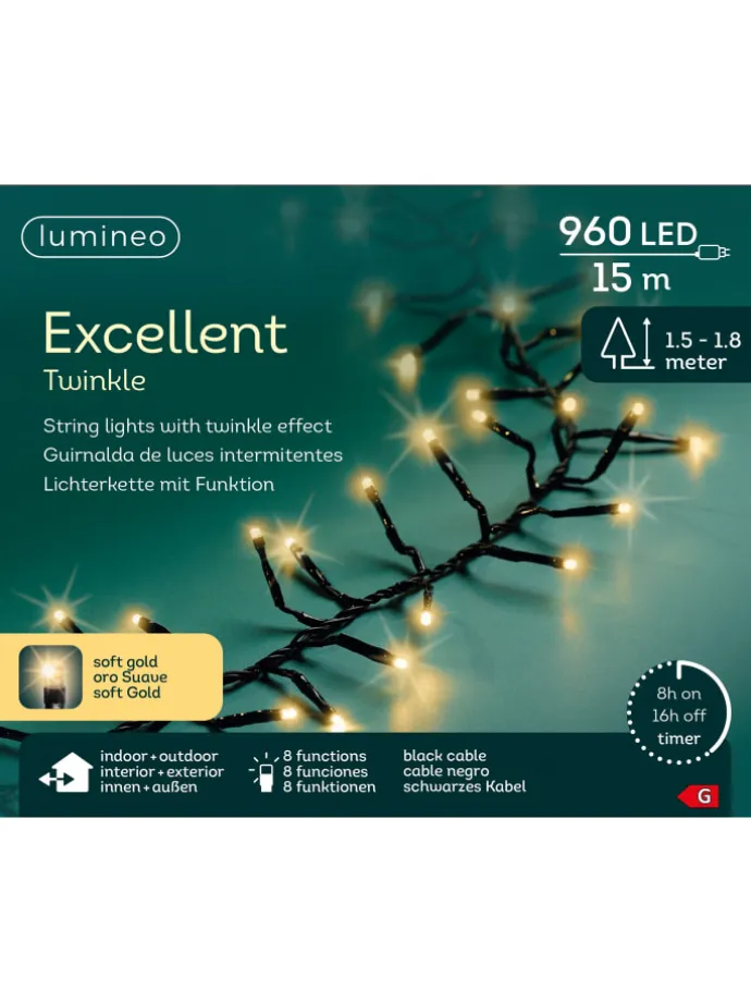 Lumineo Lichterkette EXCELLENT TWINKLE 960 LED 15 m, warm weiß Die Lichterkette verfügt über 960 LEDs, welche in einem soft goldenem Ton erstrahlen. Ob sanftes Dauerlicht, ein flackernder Effekt oder ein schimmerndes Auf und Ab – die Beleuchtung besitzt 8 verschiedene Licht-Funktionen. Dank der praktischen Timer-Funktion lässt sich die Lichterkette ganz bequem steuern, sodass sie automatisch 8 Stunden lang eingeschaltet und 16 Stunden ausgeschaltet ist. Diese Funktion spart nicht nur Energie, sondern sorgt auch dafür, dass die Lichtergirlande jeden Tag zur gleichen Zeit erstrahlt. Die Beleuchtung bietet zudem eine großzügige 5 m lange Zuleitung, wodurch die LED-Kette eine Gesamtlänge von 20 m besitzt. Mit dem IP44-Schutz ist sie Wetterbeständig und somit gegen Spritzwasser geschützt. Sie ist für den Innen- und Außenbereich geeignet. Für eine Baumhöhe von 150 – 180 cm geeignet. Mit Gütesiegel ausgezeichnet. Das Kabel ist schwarz.