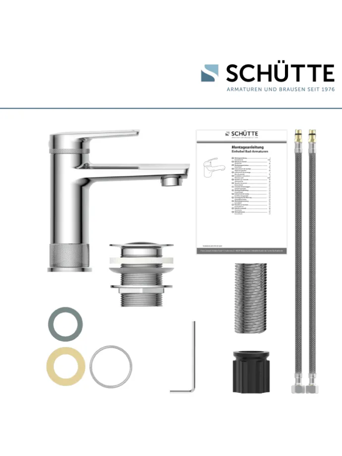 Im Lieferumfang enthalten ist ein vollständiges Montageset und eine mehrsprachige, bebilderte Montageanleitung. Die korrosionsbeständigen Anschlussschläuche (500 mm) an das Hauswassersystem sind flexibel und leicht zu montieren.