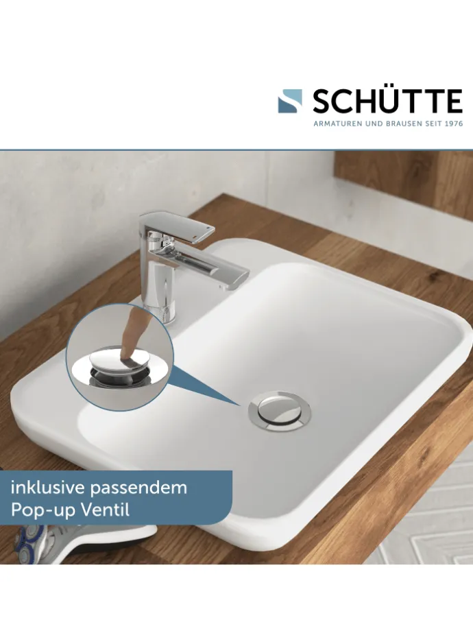 Der Wasserhahn Bad verfügt über eine Waschbecken Ablaufgarnitur mit Pop Up Ablaufventil. Bequem per Fingerdruck den Abflussstopfen öffnen und schließen. Passend zu allen Waschtisch-Siphons mit 11/4“ – Ø ca. 4 cm Anschluss.