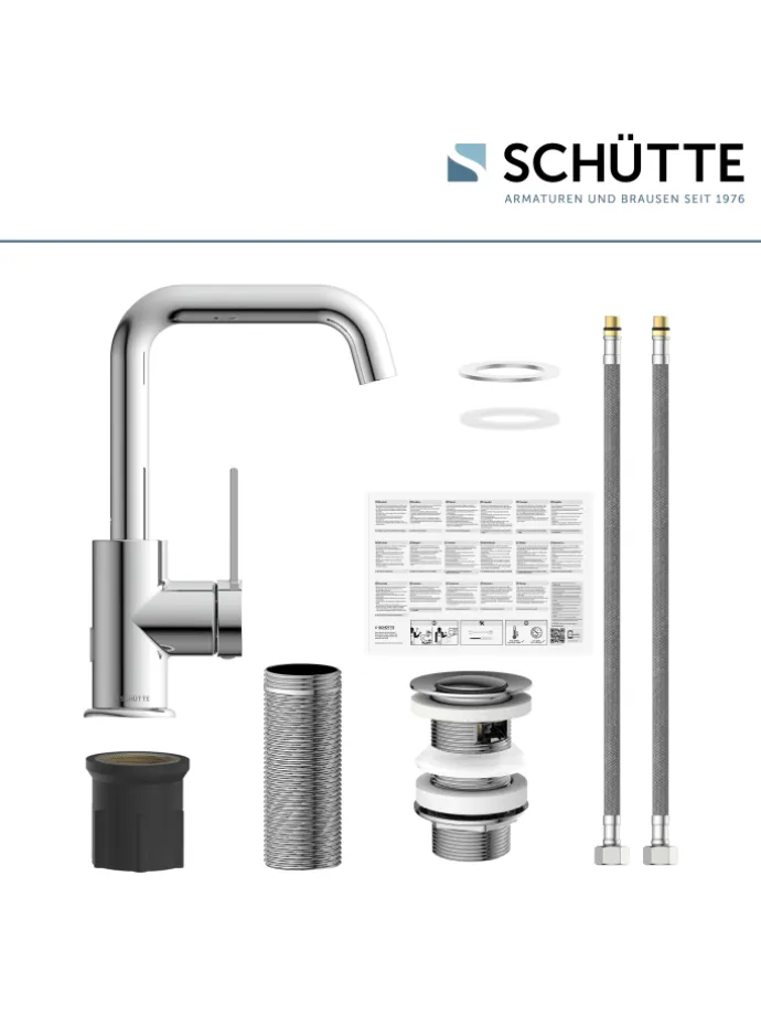 Im Lieferumfang enthalten ist ein vollständiges Montageset und eine mehrsprachige, bebilderte Montageanleitung. Die korrosionsbeständigen Anschlussschläuche (400 mm) an das Hauswassersystem sind flexibel und leicht zu montieren.