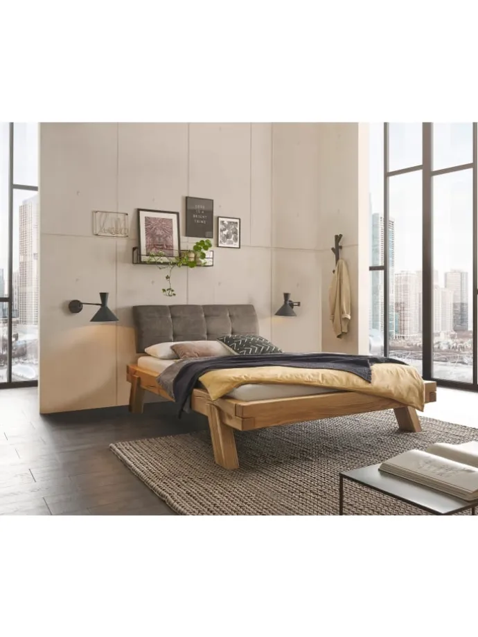 Schönes Massivholzbalkenbett in Eiche massiv geölt. Ohne Lattenrost und Matratze! Das Balkenbett wird zerlegt geliefert. Bettkopfteilhöhe ca. 90 cm, gepolstert und bezogen in Bezugsstoff anthrazit.