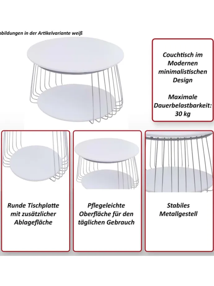 Dieser moderne Couchtisch überzeugt durch sein klares, minimalistisches Design und wird schnell zum stilvollen Blickfang in Ihrem Wohn- oder Loungebereich. Die runde Tischplatte bietet eine harmonische Optik und schafft eine angenehme, wohnliche Atmosphäre, während die zusätzliche Ablagefläche unterhalb praktischen Stauraum für Zeitschriften, Bücher, Fernbedienungen oder dekorative Elemente bietet. Das stabile Metallgestell sorgt für einen sicheren Stand und verleiht dem Tisch eine hochwertige, langlebige Qualität, die den täglichen Anforderungen problemlos standhält. Dank der pflegeleichten Oberfläche lässt sich der Couchtisch mühelos reinigen und bleibt auch bei regelmäßiger Nutzung lange ansprechend. Mit seiner zeitlosen Gestaltung fügt sich das Möbelstück flexibel in unterschiedliche Einrichtungsstile ein – von modern über skandinavisch bis hin zu urbanem Loft-Stil. Ob als Ablage neben dem Sofa, als zentraler Couchtisch im Wohnzimmer oder als elegantes Element in einer Lounge, dieser Tisch verbindet Funktionalität mit ästhetischem Anspruch. Die maximale Dauerbelastbarkeit von 30 kg bietet ausreichend Stabilität für den Alltag. Die Lieferung erfolgt ohne Dekoration.
