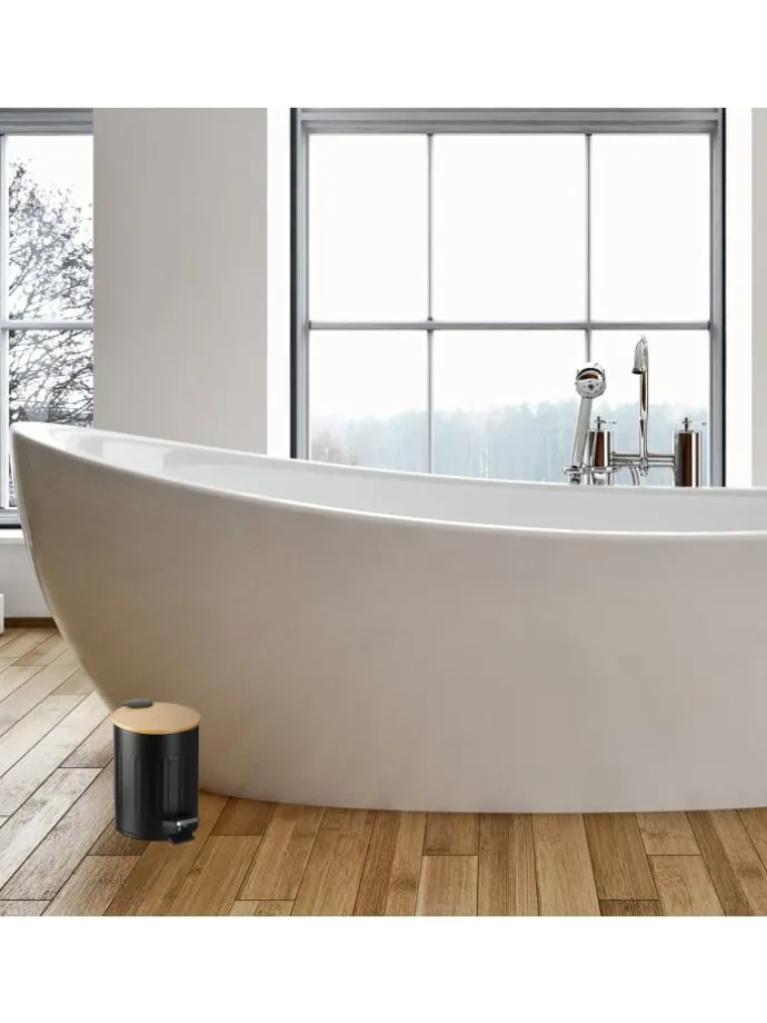 In dem runden Treteimer kannst Du hygienisch und komfortabel Deine Hygieneabfälle im Bad und am Schminktisch entsorgen. Mit dem praktischen Trittpedal lässt sich der Badezimmereimer freihändig öffnen, das Schließen des Deckels gelingt dank Softclose-Funktion besonders sanft und leise. Der entnehmbare Kunststoffeimer mit Griff sorgt für ein leichtes Entleeren des Abfalleimers. Optisch begeistert der Badezimmermülleimer mit seiner matten Oberfläche und dem natürlichen Bambusdeckel.