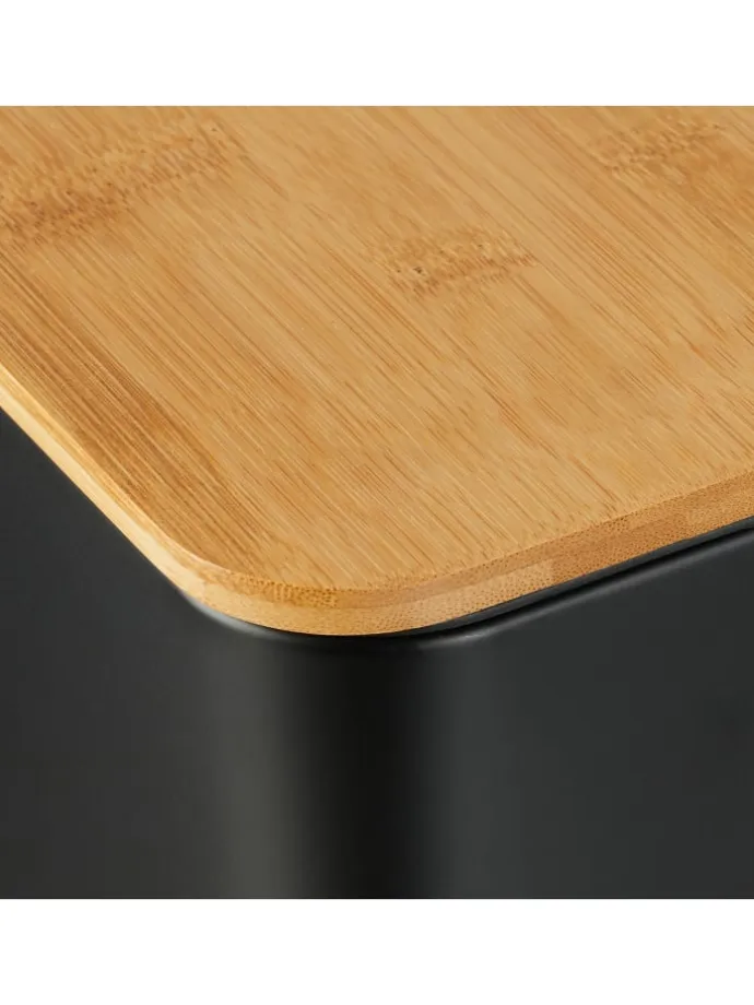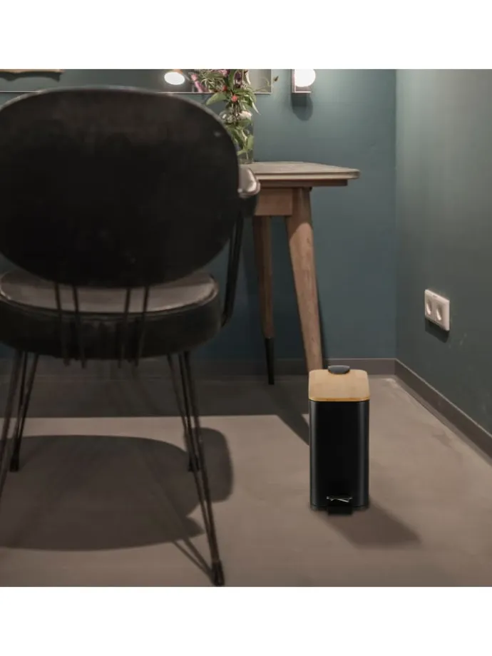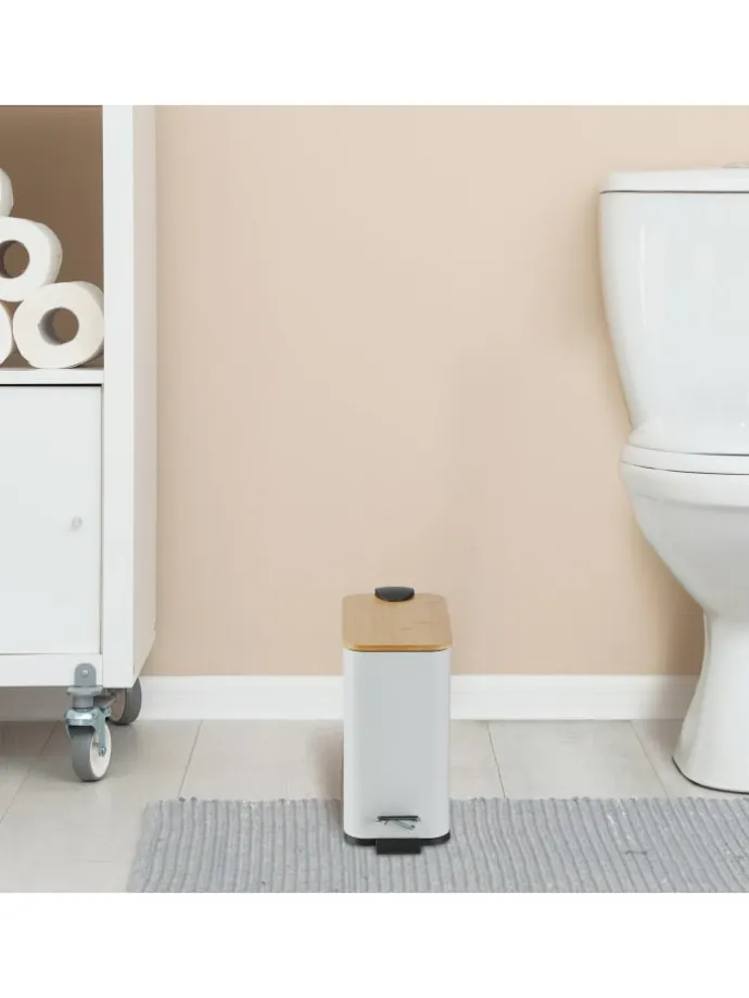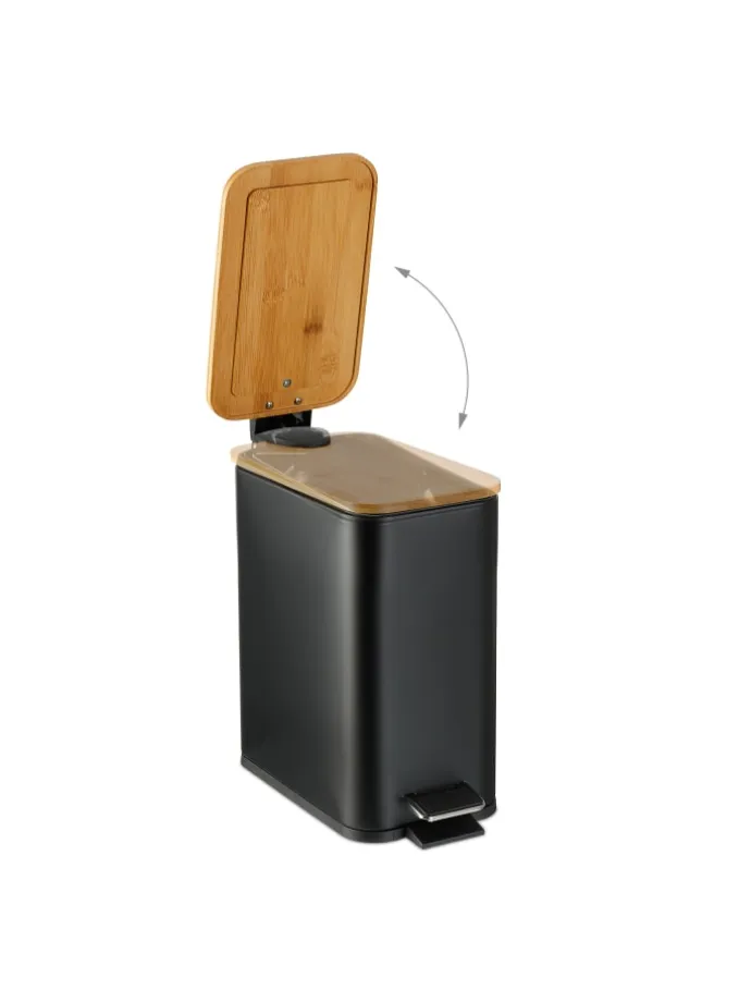 In dem eckigen Treteimer kannst Du hygienisch und komfortabel Deine Abfälle im Bad oder am Schminktisch entsorgen. Mit dem rutschfesten Trittpedal lässt sich der Badezimmereimer bequem freihändig öffnen. Der entnehmbare Kunststoffeimer mit Henkel sorgt für ein leichtes Entleeren des Abfalleimers. Zudem setzt der dekorative Materialmix aus mattem Eisen und natürlichem Bambusdeckel moderne Akzente in Deinem Badezimmer.