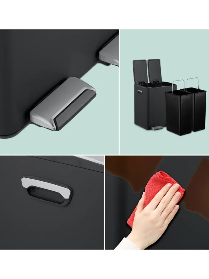 Entsorge Deine Abfälle in der Küche oder dem Büro hygienisch in diesem Treteimer. Dank seiner 2 Fächer eignet sich der Abfalleimer hervorragend für Papier-, Plastik- oder Restmüll. Mit dem praktischen Trittpedal lässt sich der Kücheneimer ohne lästiges Bücken bequem öffnen. Die Deckel schließen dank Soft-Close-Funktion leise und sanft. Der Mülleimer aus pulverbeschichtetem Eisen ist robust und begeistert durch sein modernes Design mit abgerundeten Ecken.