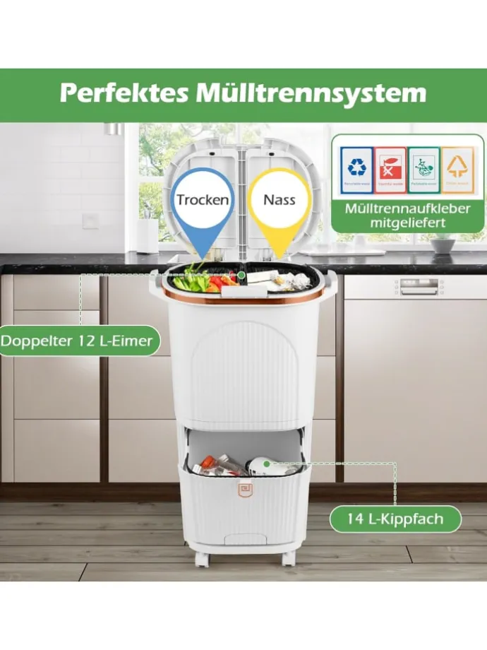 Dieser 2-stufige Mülleimer wurde entwickelt, um das Sortieren mit zwei 12L Eimern und einem 14L kippbaren Fach zu vereinfachen, perfekt für nassen, trockenen und wiederverwertbaren Müll. Müllsortieraufkleber erleichtern eine schnelle und genaue Entsorgung. Die 2 push-top Deckel und der Zuggriff sorgen für einfache Öffnung. Das ausziehbare Fußpedal ermöglicht die berührungslose Bedienung. Dank integrierten Seitengriffen und 4 Universalrollen ist die Mobilität kinderleicht, wobei 2 Rollen abschließbar sind für stabile Positionierung. Die PP-Konstruktion ist mit abnehmbaren Sektionen ausgestattet, was die tägliche Wartung erleichtert. Kompakt, aber ergonomisch hoch, passt dieser platzsparende Abfalleimer nahtlos in Küche, Bad oder Büro und ermöglicht Müllentsorgung ohne Bücken.