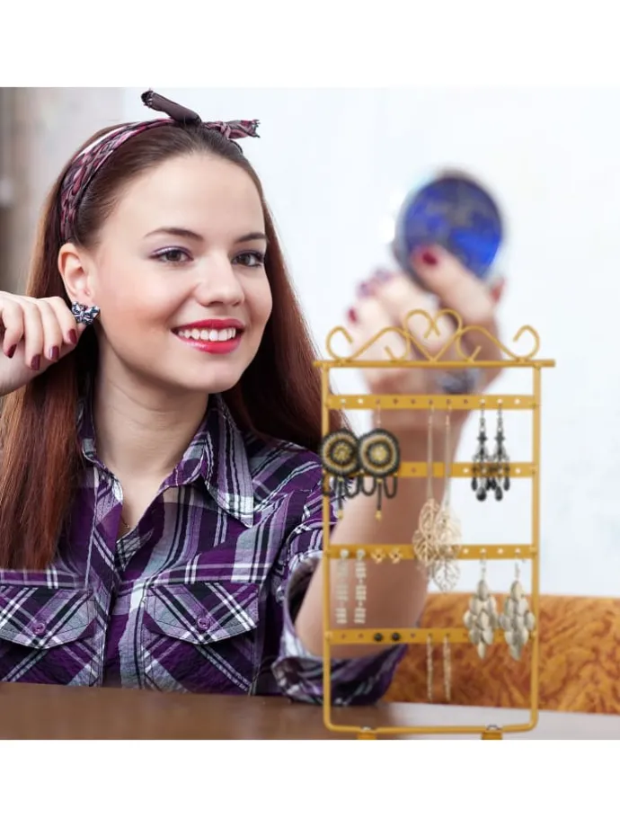 Mit diesem Ohrringständer haben Sie den passenden Ohrschmuck für Ihr Outfit jederzeit parat. Der Schmuckhalter bietet auf 4 Etagen ausreichend Stauraum, um Ihre Lieblingsstücke unterzubringen. Insgesamt verfügt der Schmuck Organizer über 44 Steckplätze für Ohrstecker oder lange Ohrringe. Der Ohrringhalter überzeugt durch sein romantisches Design mit den nostalgischen Verzierungen. Dank der Auswahl aus verschiedenen Farben ist sicher auch ein Schmuckständer für Ihr Bade- oder Schlafzimmer dabei.