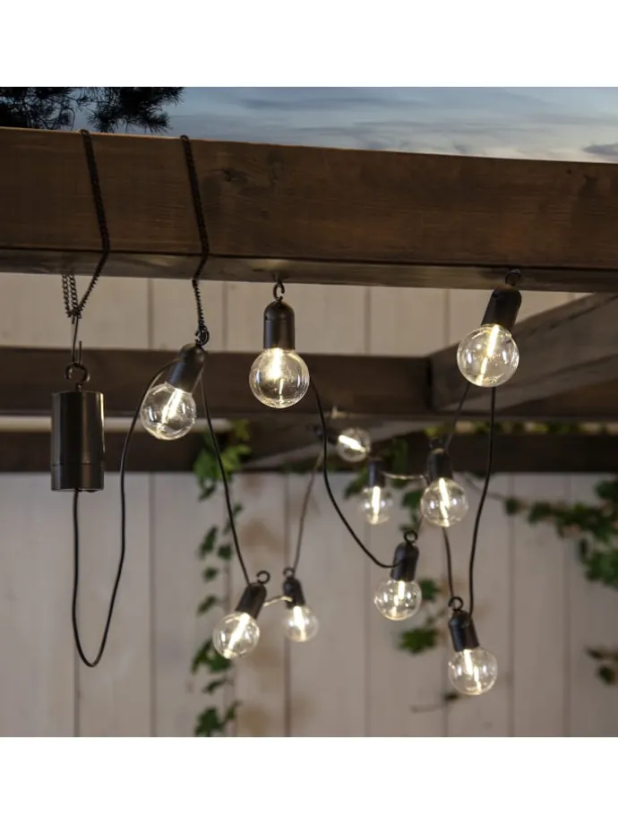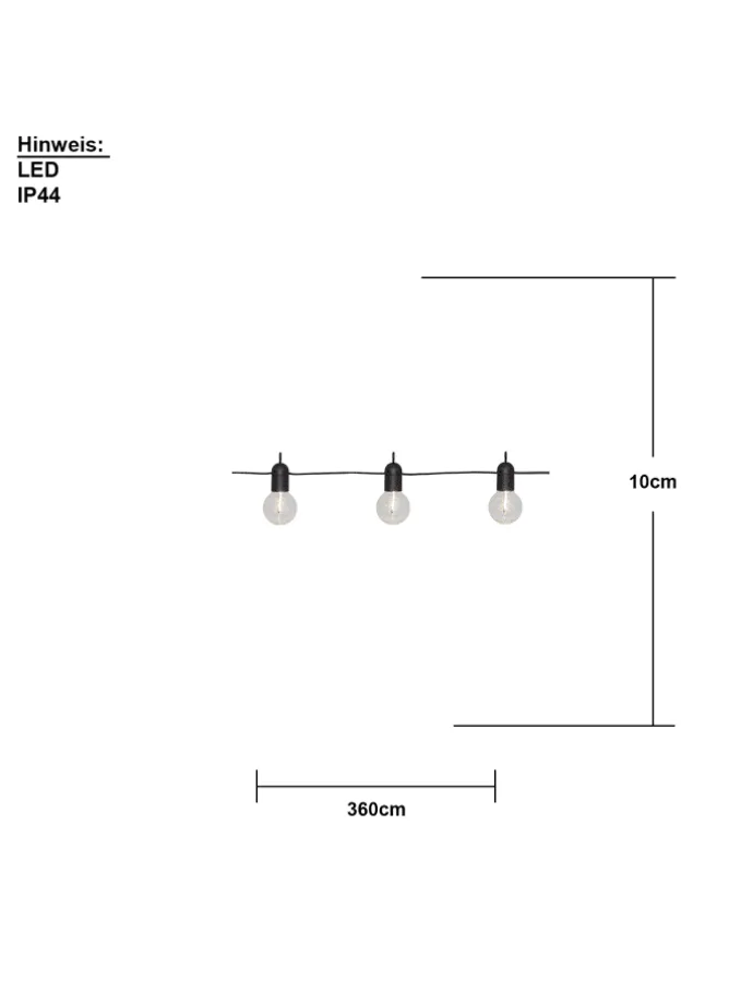 Die Lichterkette besteht aus 10 klassischen transparenten Glühbirnen, welche an einem 3,6 Meter langem, schwarzen Kabel befestigt wurden