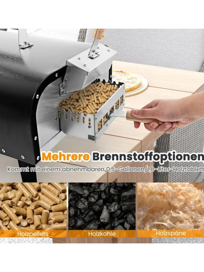 Genießen Sie jedes Mal köstliche Pizza mit diesem manuell drehbaren Outdoor-Pizzaofen! Mit einem sanft drehbaren 30 cm Pizzastein und hocheffizienter Heizung wird diese Pizza in wenigen Minuten fertig. Seine dreilagige Konstruktion mit Premium-Qualität sorgt für eine überlegene Wärmespeicherung und gleichmäßige Verteilung. Geeignet für verschiedene Brennstoffe wie Holz, Holzkohle und mehr, deckt er alle Ihre Kochbedürfnisse ab. Sie können den Ofen auch zum Grillen von Spießen, Steaks, Brot usw. verwenden. Kompakt und tragbar mit klappbaren Beinen und einer mitgelieferten Tasche, ist er ideal für jeden Außenbereich. Verbessern Sie Ihr Pizzaspiel mit diesem vielseitigen und effizienten Outdoor-Ofen.