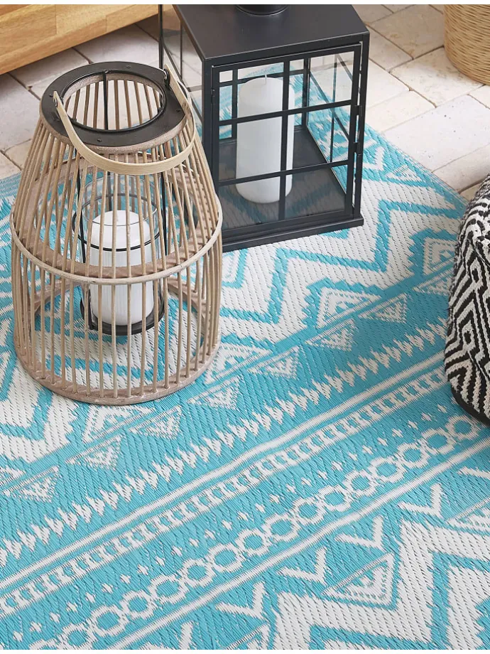 Rechteckige Matte in Türkis für den Außen- und Innenbereich. Bei diesem Teppich handelt es sich um eine überaus robuste Variante, die zudem auch noch formbeständig und schimmelresistent ist. Da Feuchtigkeit von der hochwertigen, recycleten Kunstfaser nicht aufgenommen wird, bedarf dieses Modell nur einer minimalen Pflege. Kombinieren Sie diesen originellen türkisen Farbton mit passenden Möbeln und Dekorationen, um eine angenehme Wohlfühlatmosphäre und gelassene Heiterkeit in die eigenen vier Wände zu zaubern.