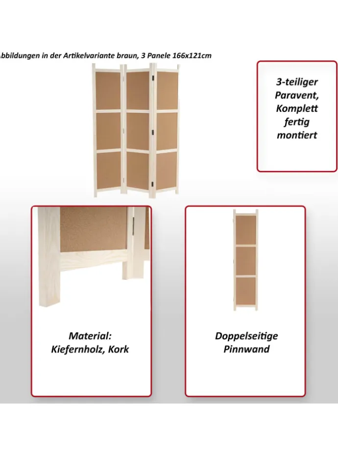 Dieser Paravent überzeugt vor Allem durch seine Möglichkeit ihn völlig individuell zu gestalten. Sowohl für Bilder als auch für Ihre Notizen und Erinnerungen, oder einfach als Möglichkeit sich künstlerisch und frei zu entfalten: Die Gestaltungsmöglichkeit kennt kaum Grenzen, ganz egal ob Sie ihn im Eingangsbereich, im Wohnzimmer, im Schlafzimmer oder im Kinderzimmer platzieren! Und sollte er nicht benötigt werden, können Sie ihn mühelos und platzsparend zusammenklappen. Der Clou: Der Paravent ist beidseitig verwendbar, sodass jeder neu gestaltete Raum einen eigenen Charakter erhält.
