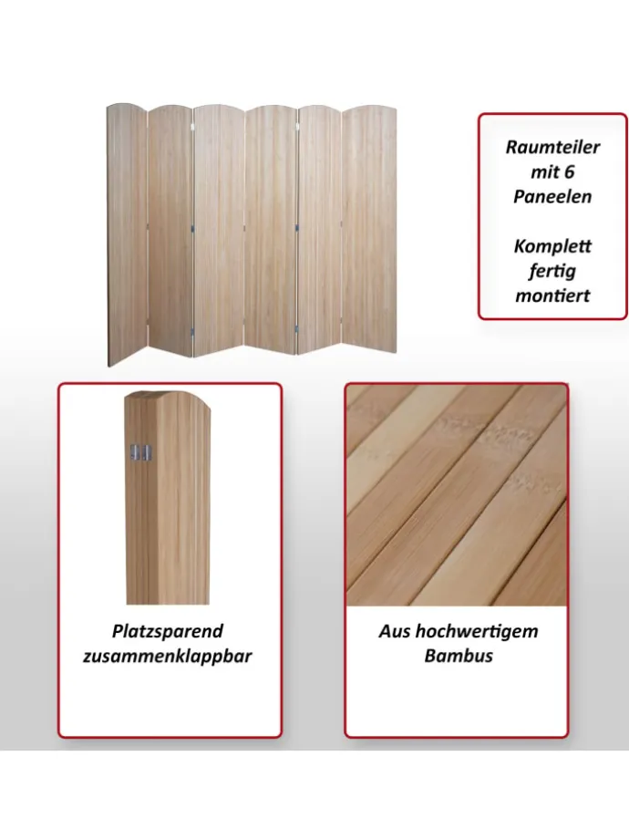 Der stilvolle Paravent mit sechs Paneelen aus hochwertigem Bambus vereint natürliche Eleganz mit praktischer Funktionalität und bringt ein warmes, harmonisches Wohngefühl in jeden Raum. Ob als dekorativer Raumteiler, flexibler Sichtschutz oder als ästhetisches Highlight – dieser Paravent setzt gezielte Akzente und schafft zugleich Privatsphäre, ohne dabei erdrückend zu wirken. Die feine Bambusstruktur verleiht dem Raum eine ruhige, organische Atmosphäre und sorgt durch das durchlässige Design für eine angenehme Lichtverteilung. Besonders in kleinen Wohnbereichen erweist sich der Paravent als intelligenter Helfer, denn er trennt Wohnzonen klar voneinander ab und lässt den Raum dabei optisch größer wirken – ideal für Studio-Apartments, Schlafbereiche, Büros oder Home-Office-Lösungen. Dank der klappbaren Konstruktion lässt sich der Paravent bei Bedarf platzsparend zusammenfalten und schnell verstauen, ohne auf Stil verzichten zu müssen. Die vier beweglich verbundenen Elemente ermöglichen maximale Flexibilität in der Positionierung – gerade, gewinkelt oder leicht gebogen. Ein weiterer Vorteil: Der Paravent wird komplett fertig montiert geliefert, sodass kein zeitaufwendiger Aufbau nötig ist. Einfach ausklappen und sofort nutzen. Dieses funktionale Designobjekt überzeugt durch seine hochwertige Verarbeitung, die Langlebigkeit des Materials und seine vielseitigen Einsatzmöglichkeiten – ob im Schlafzimmer, Wohnzimmer, Büro oder auch in gewerblichen Räumen wie Praxen oder Studios. Der Bambus-Paravent ist die perfekte Kombination aus Natürlichkeit, Komfort und Stil und eine kluge Wahl für alle, die Räume neu denken möchten, ohne bauliche Veränderungen vorzunehmen.