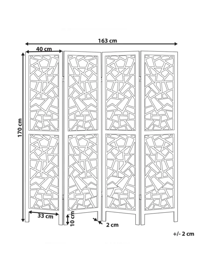 Holz-Raumteiler mit durchsichtigem Lochmuster. Schaffen Sie Ihren eigenen privaten Raum mit diesem einzigartigen 4-teiligen Raumteiler, der zeitlose Tradition mit moderner Eleganz verbindet. Aus Paulownia-Holz gefertigt, verleiht sie jedem Raum nicht nur einen Hauch von Raffinesse, sondern ist auch langlebig und pflegeleicht. Da die Trennwand zusammenklappbar ist, lässt sie sich leicht verstauen. Die stilvolle Farbe macht sie zu einem funktionalen und auffälligen Blickfang.