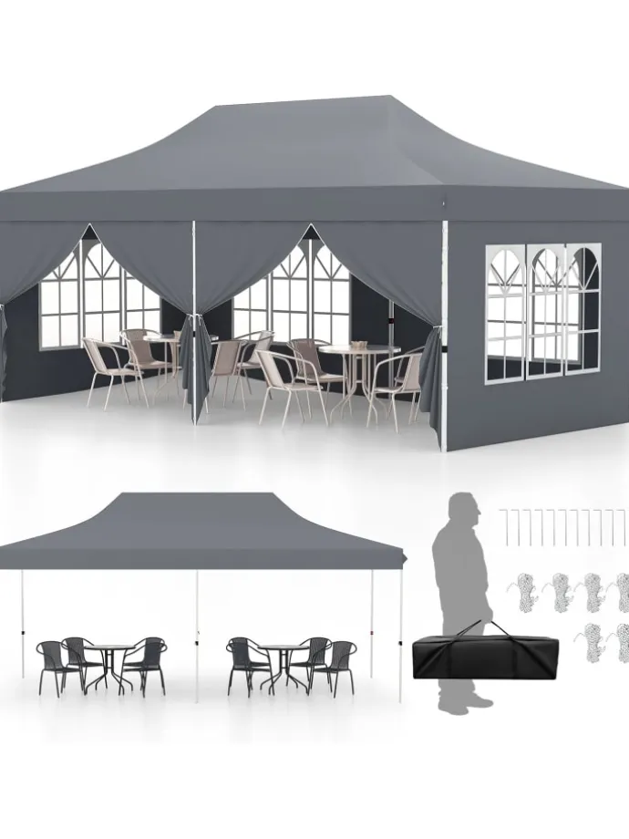 Unser großer Pavillon hat die Maße 300 x 600 x 296-316 cm (L x B x H) und bietet einen großen schattigen Platz im Freien für Picknicks, Grillpartys, Feste, Hochzeiten, Camping, gewerbliche Nutzung und mehr. Es gibt 6 abnehmbare Seitenwände und 2 davon verfügen über Eingänge mit Reißverschluss, die einen schnellen Zugriff ermöglichen und bei Bedarf zusätzliche Privatsphäre bieten. Darüber hinaus wird das Zelt von einem robusten, pulverbeschichteten Metallrahmen und einem strapazierfähigen Oxford-Stoffdach getragen, was seine Haltbarkeit bei allen Wetterbedingungen gewährleistet. Und der Schirmstoff mit Silberbeschichtung bietet hervorragenden Sonnenschutz. Außerdem bieten wir 12 Erdspieße aus Metall und 6 Windseile an, mit denen Sie das Eventzelt fest am Boden befestigen und so für mehr Stabilität und Sicherheit sorgen können.