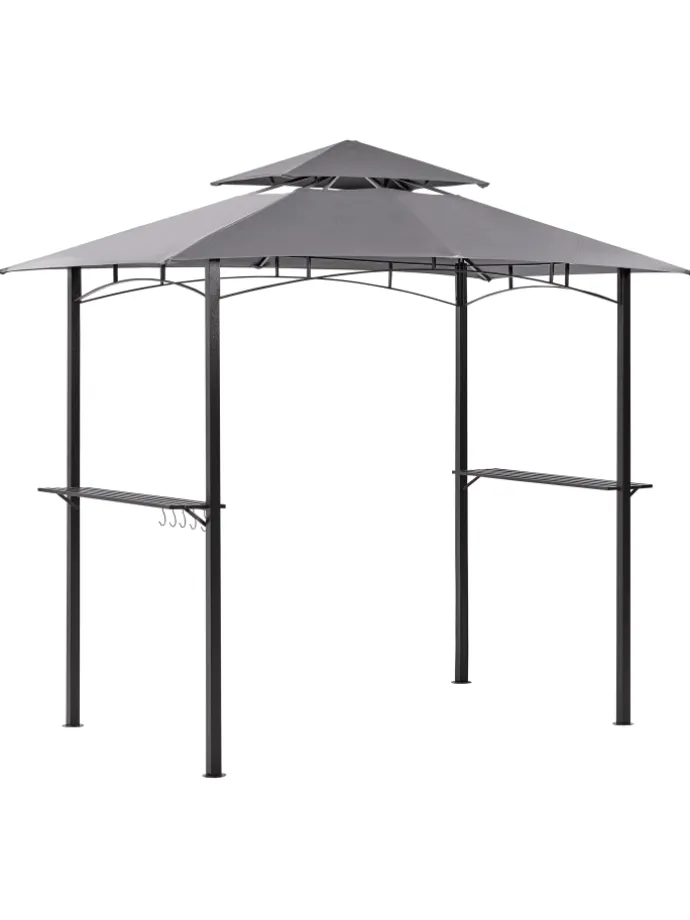 Moderner Gartenpavillon mit Regalanlagen. Richten Sie Ihren Garten mit diesem Gartenpavillon für die Grillsaison und warme Sommerabende mit Freunden und Familie ein. Er bietet ausreichend Platz für ein kleines Ess- oder Loungeset. Er ist aus langlebigem, pulverbeschichtetem Stahl gefertigt, der für eine stabile Struktur sorgt. Das Vordach ist aus einem Material gefertigt, das perfekt vor UV-Strahlen schützt, und verfügt über eine Öffnung im Dach, die eine durchgehende Belüftung gewährleistet. Darüber hinaus verfügt der Pavillon über Metallregale und Haken, die zur Aufbewahrung von Utensilien oder zur Aufstellung von Blumentöpfen verwendet werden können und ihn so noch stilvoller machen.