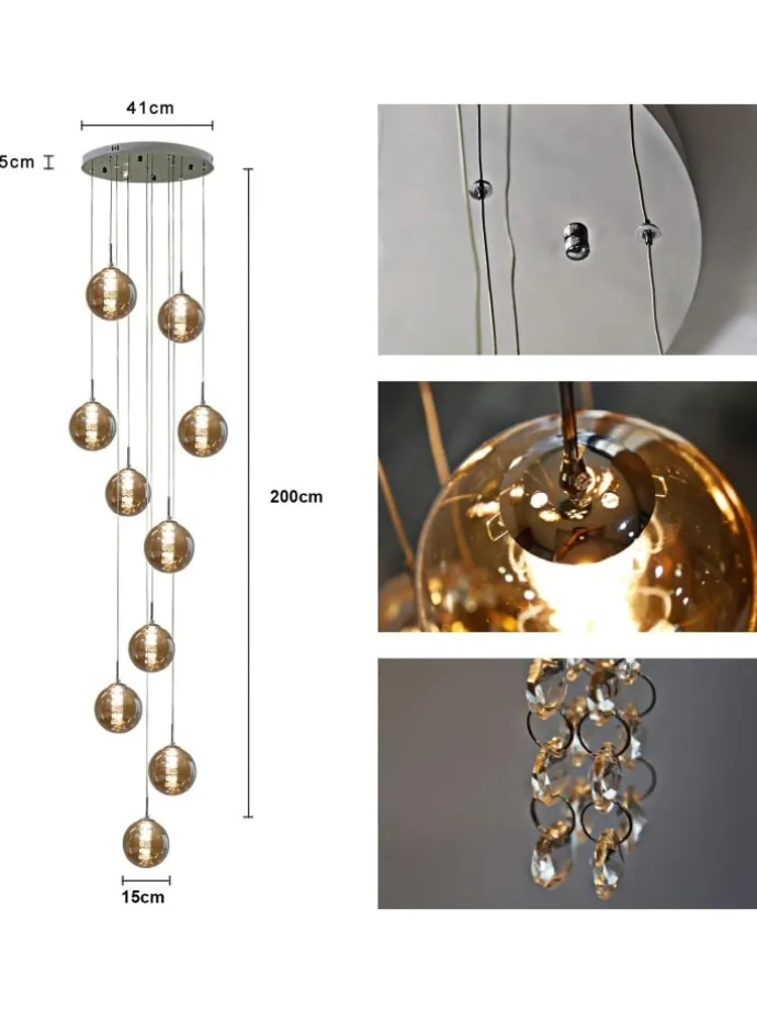 Produktabmessungen – Durchmesser ø15cm (jede Kugel in Farbe Bernstein), das Maß der Deckenlpatte: ø41*3.5cm, Spannung:230V, Kabellänge: 2M