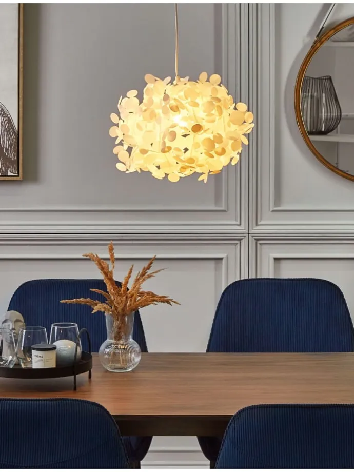 Extravagante und verspielte Hängelampe in Weiß. Dank ihrer ausgefallenen und extravaganten Formgebung lässt sich diese Hängeleuchte wunderbar mit jedem Einrichtungsstil kombinieren. Die vielen Kunststoffelemente wirken wie Blumenblüten, sind in schlichtem Weiß gehalten und werden raffiniert zusammengesteckt. Somit erhält der Lampenschirm eine verspielte Ausstrahlung und schafft traumhaft schöne Licht- und Schatteneffekte.