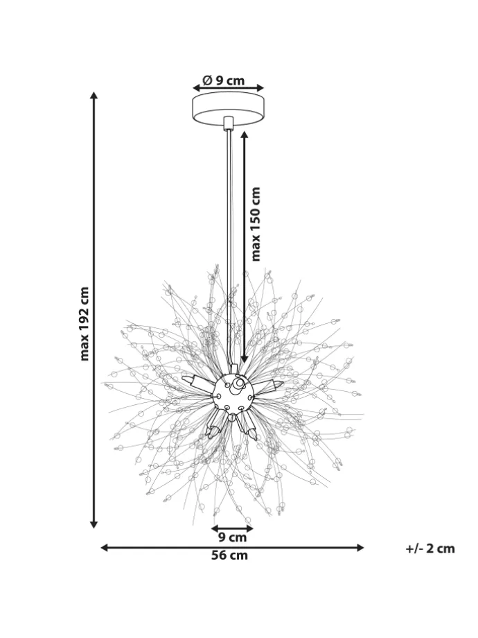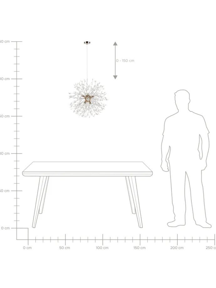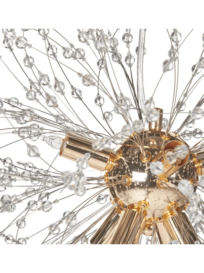 Moderne, 8-flammige Pendelleuchte mit Glaskristallsteinen. Setzen Sie auf dieses ganz besondere Modell und bringen Sie etwas Helligkeit in Ihre Wohnräume. Diese Pendellampe bezaubert mit ihrem einzigartigen Design, das an einen blühenden Löwenzahn oder eine glitzernde Schneeflocke erinnert. Für einen entsprechenden Schimmer und spannende Lichteffekte sorgen die gläsernen Kristallsteine, die am Schirm befestigt sind. Das vortreffliche Schattenspiel und die goldene Mitte der Hängelampe werden jeden Ihrer Gäste bestimmt bezaubern. So eignet sich die Leuchte sowohl als Eyecatcher für den Eingangsbereich, das Schlafzimmer und Wohnzimmer als auch als Highlight über dem Esstisch.