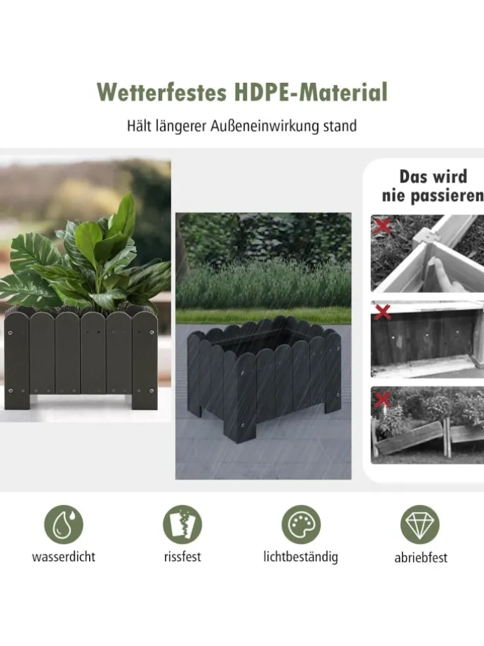 Die Kunststoff-Pflanzkästen für den Außenbereich werden Ihrer Fantasie freien Lauf lassen und eignen sich perfekt für die Präsentation Ihrer Lieblingspflanzen, Blumen und Kräuter. Diese aus hochwertigem HDPE gefertigten Pflanzkästen sind so konstruiert, dass sie den Witterungseinflüssen im Freien standhalten, was sie zu einer zuverlässigen Wahl für Ihre Gartenarbeit macht. Jedes Set enthält 2 Pflanzkästen, sodass Sie eine perfekt abgestimmte Anordnung erstellen können. Die simulierte Holzmaserung und das Zaundesign ergänzen jede Außenumgebung und sorgen für einen rustikalen und dennoch eleganten Look.