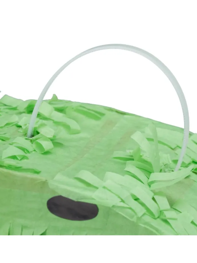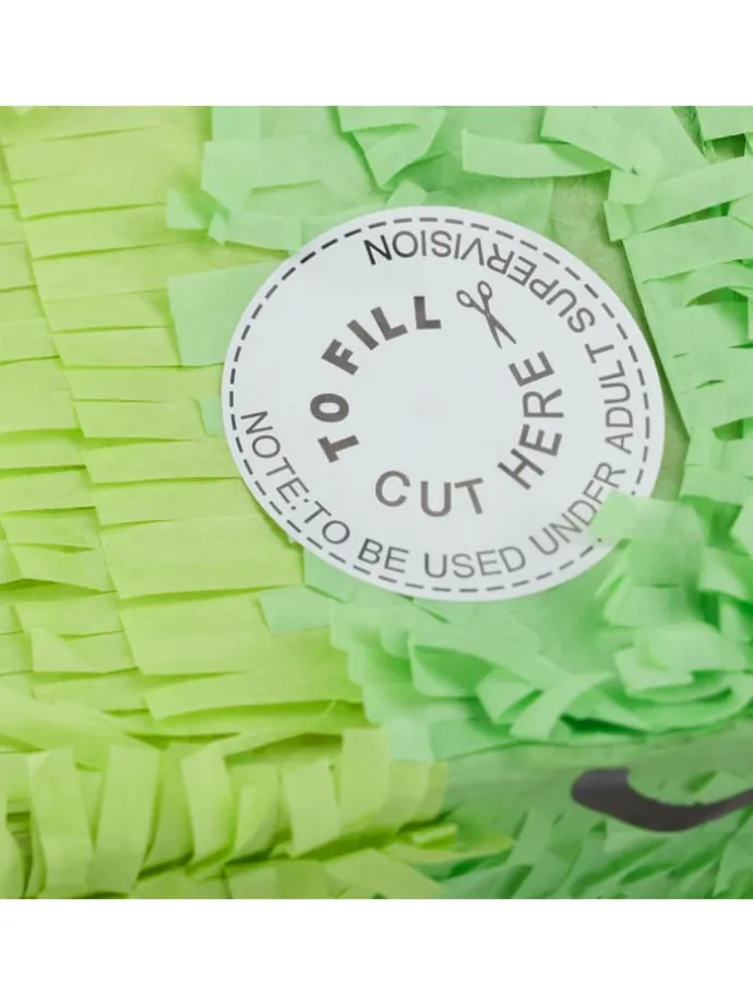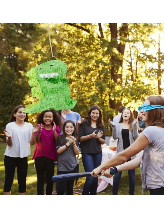 Mit dieser Dinosaurier Pinata sorgen Sie im Handumdrehen für gute Stimmung auf dem nächsten Kindergeburtstag. Der grüne Tyrannosaurus kann mit Süßigkeiten, Spielzeug, Geschenken oder Konfetti befüllt werden. Die Kinder schlagen dann abwechselnd mit verbundenen Augen mit einem Stock auf den Dino ein, bis er aufplatzt und die Überraschungen herausfallen. Je höher die Pinata gehangen wird, umso größer ist der Schwierigkeitsgrad. Als lustige Partydeko sorgt der T-Rex für einen tollen Blickfang.